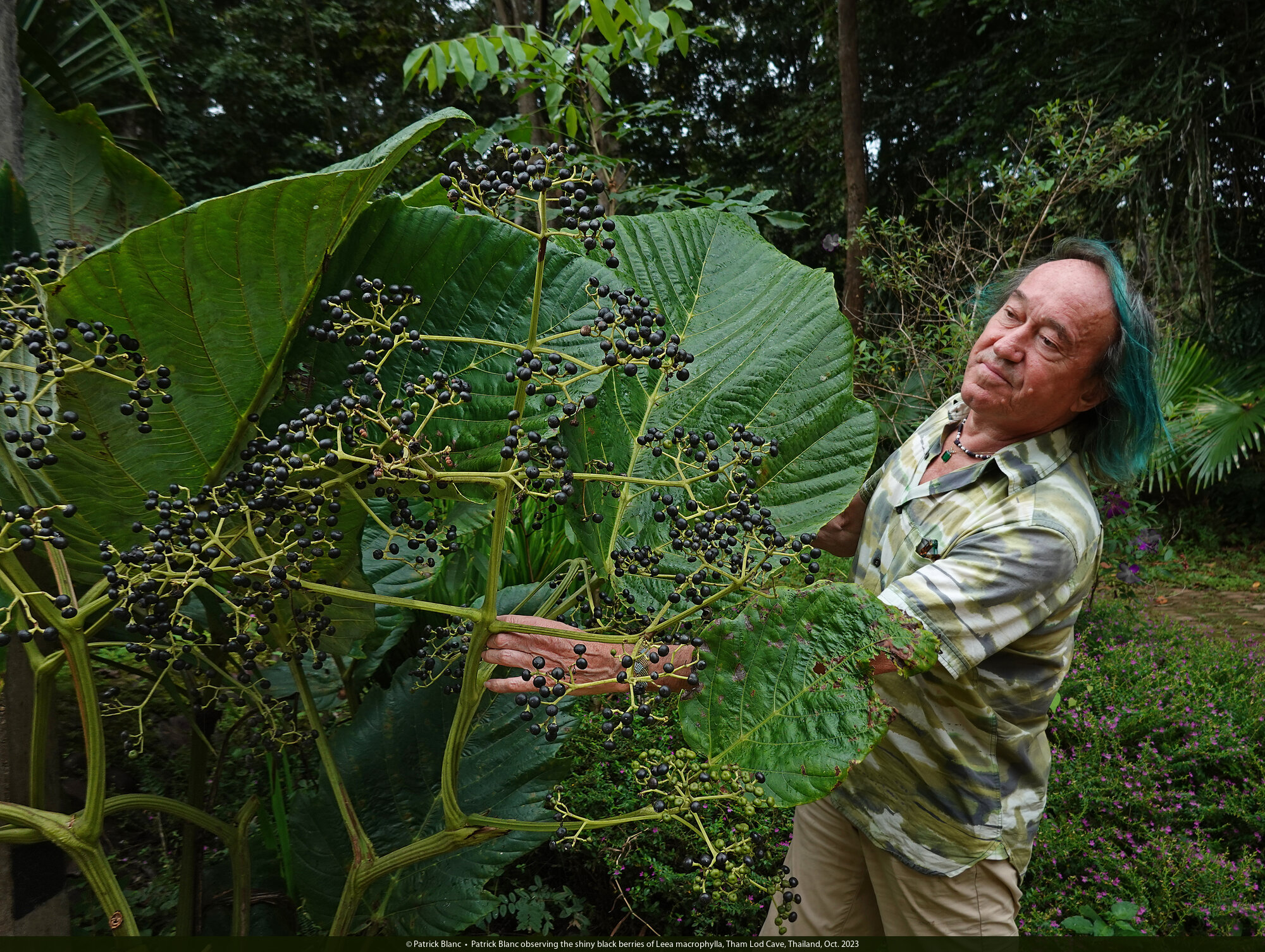 Patrick Blanc observing the shiny black berries of Leea macrophylla, Tham Lod Cave, Thailand, Oct. 2023
