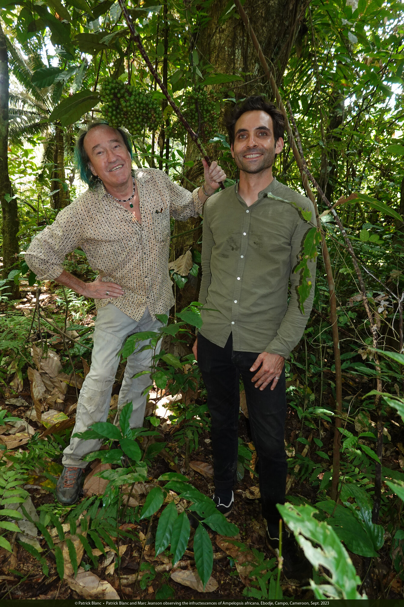 Patrick Blanc and Marc Jeanson observing the maturing infructescences of Ampelopsis africana, Ebodje, Campo, Cameroon, Sept. 2023