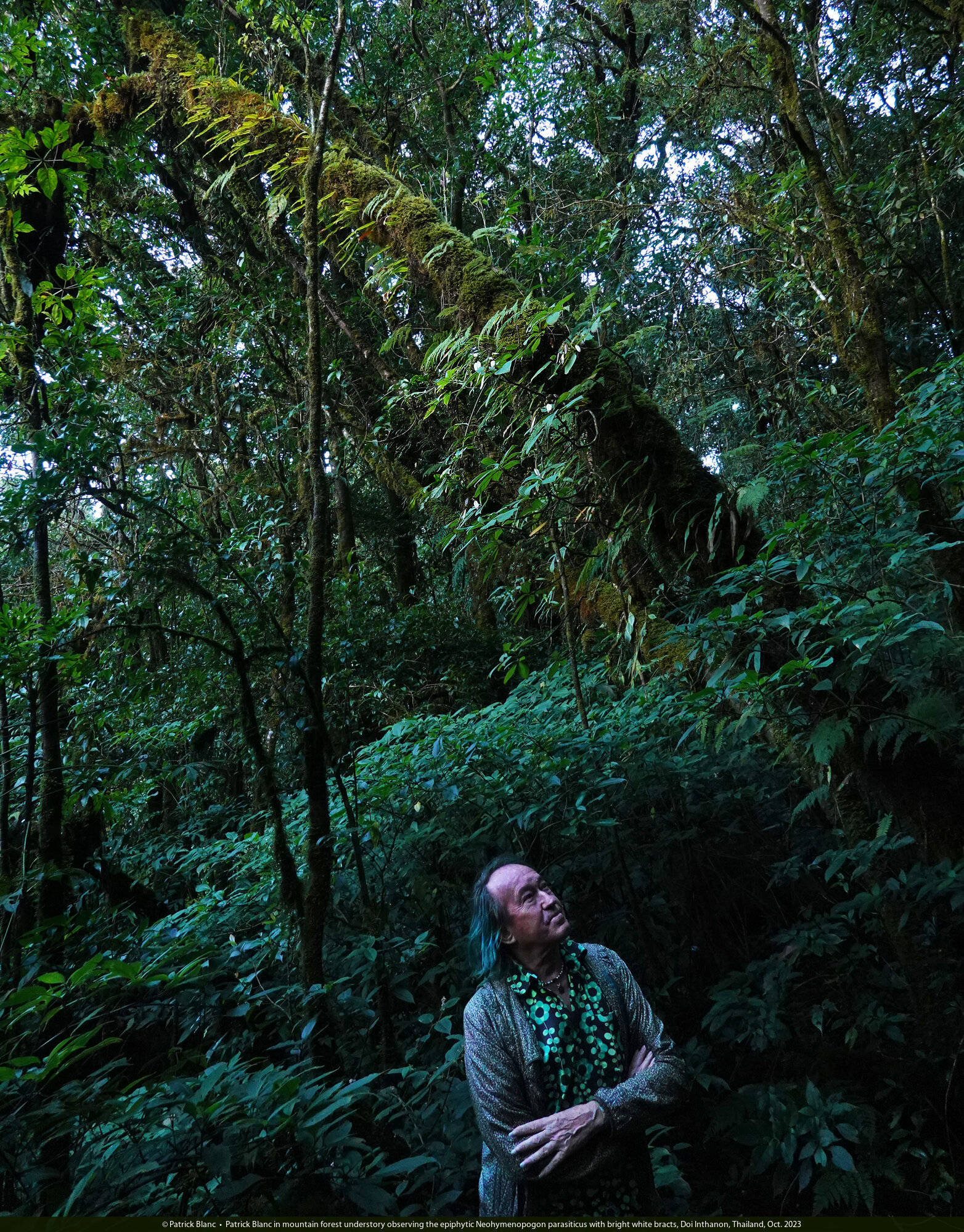 Patrick Blanc in mountain forest understory observing the epiphytic Neohymenopogon parasiticus with bright white bracts, Doi Inthanon, Thailand, Oct. 2023