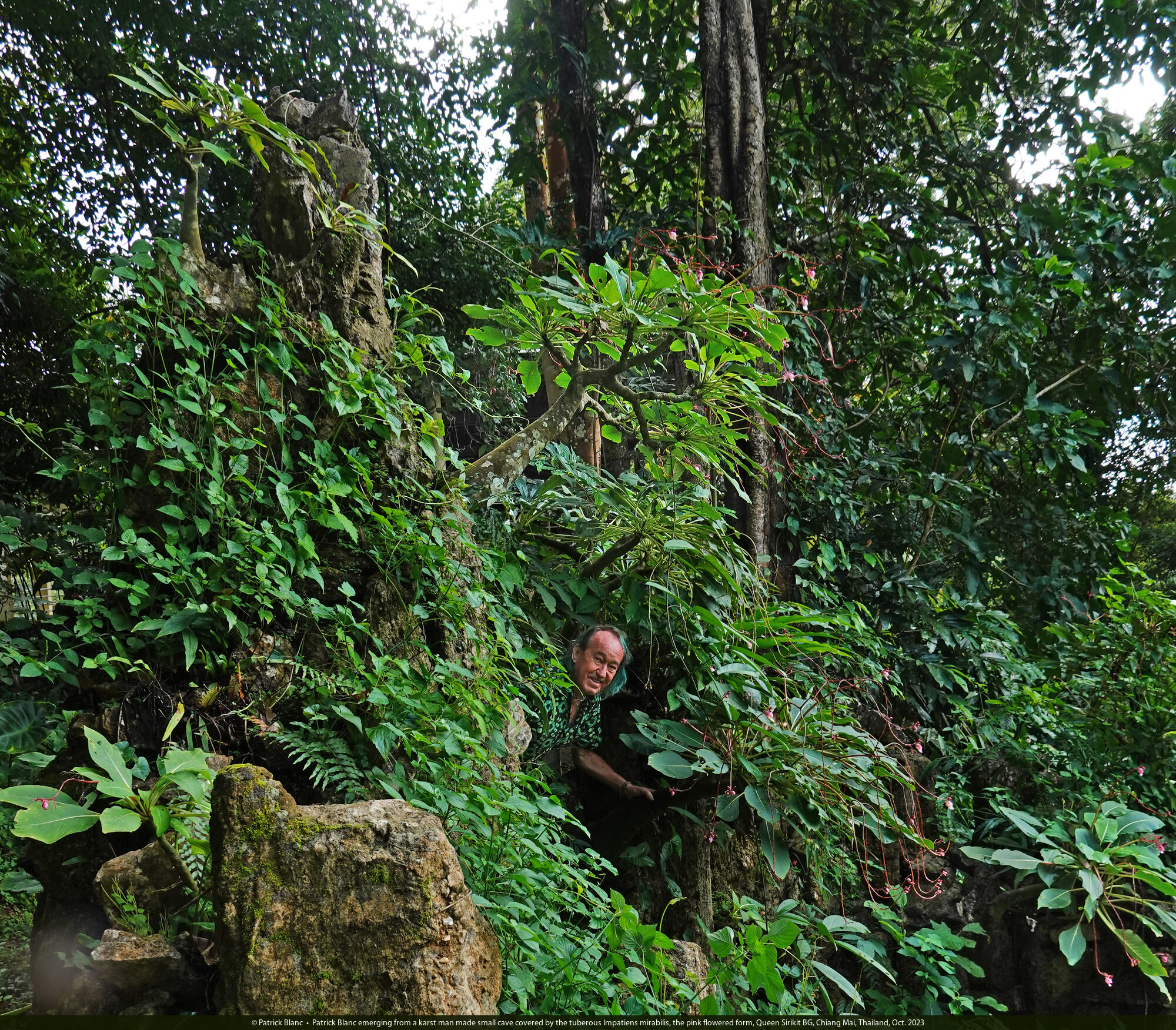Patrick Blanc emerging from a karst man made small cave covered by the tuberous Impatiens mirabilis, the pink flowered form, Queen Sirikit BG, Chiang Mai, Thailand, Oct. 2023
