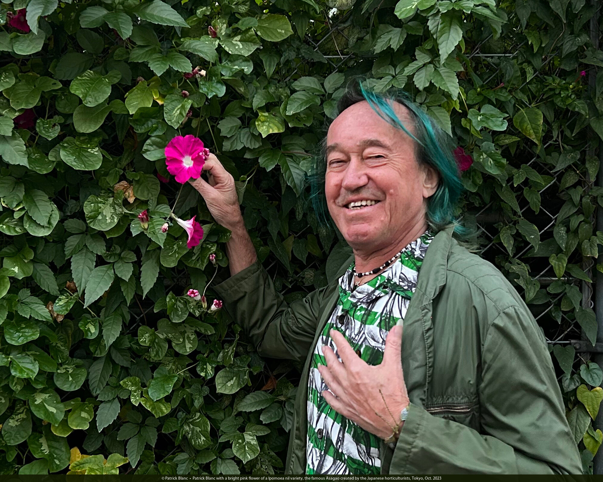 Patrick Blanc with a bright pink flower of a Ipomoea nil variety, the famous Asagao created by the Japanese horticulturists, Tokyo, Oct. 2023