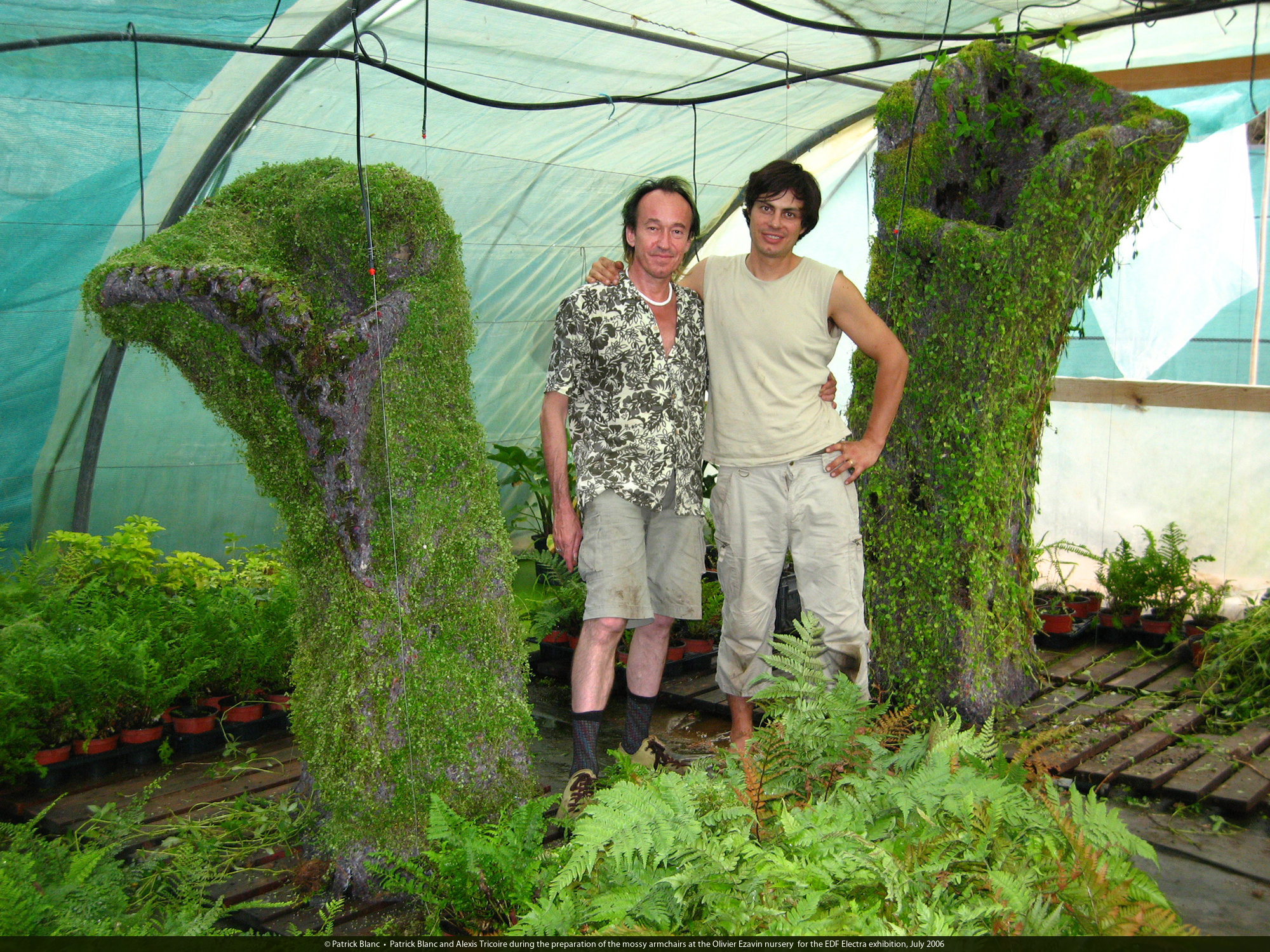 Patrick Blanc and Alexis Tricoire during the preparation of the mossy armchairs at the Olivier Ezavin nursery for the EDF Electra exhibition, July 2006