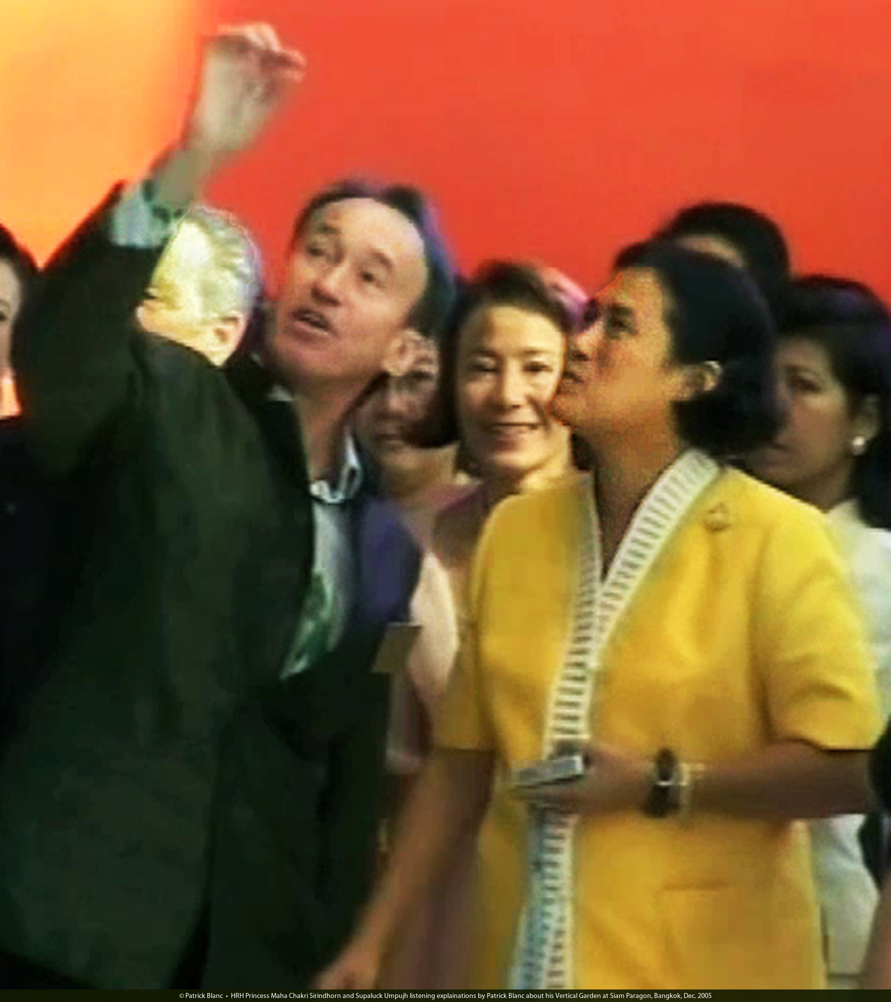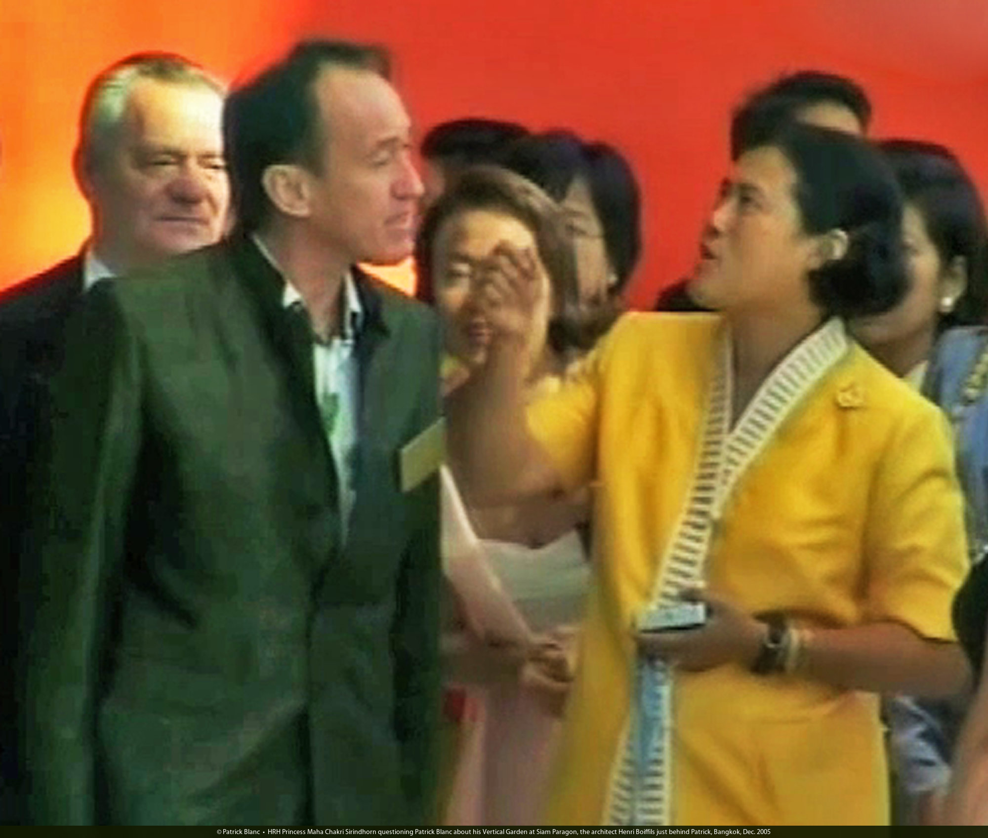 HRH Princess Maha Chakri Sirindhorn questioning Patrick Blanc about his Vertical Garden at Siam Paragon, the architect Henri Boiffils just behind Patrick, Bangkok, Dec. 2005