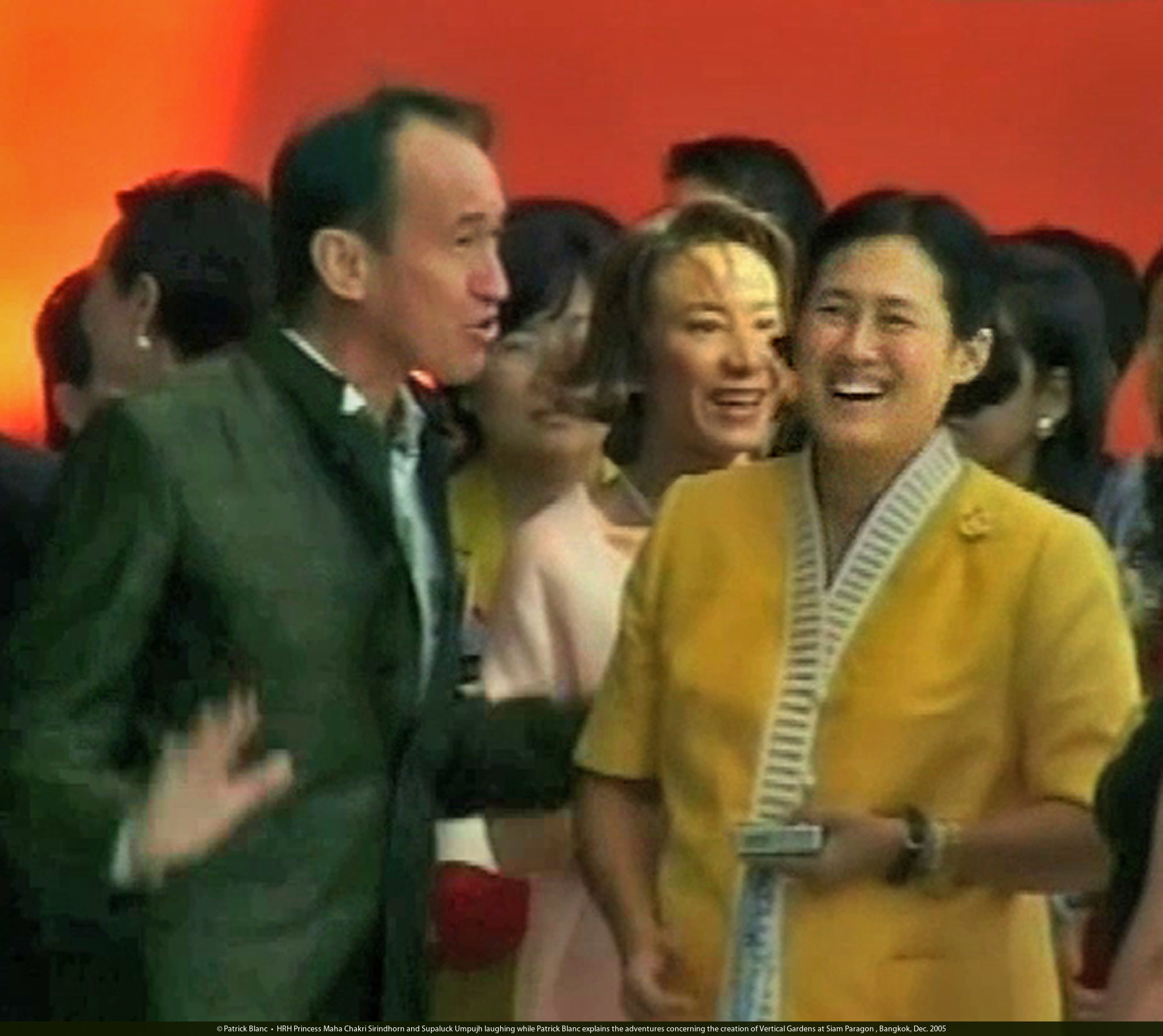 HRH Princess Maha Chakri Sirindhorn and Supaluck Umpujh laughing while Patrick Blanc explains the adventures concerning the creation of Vertical Gardens at Siam Paragon , Bangkok, Dec. 2005