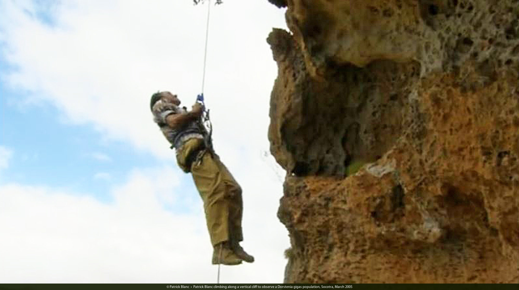 Patrick Blanc climbing along a vertical cliff to observe a Dorstenia gigas population, Socotra, March 2005
