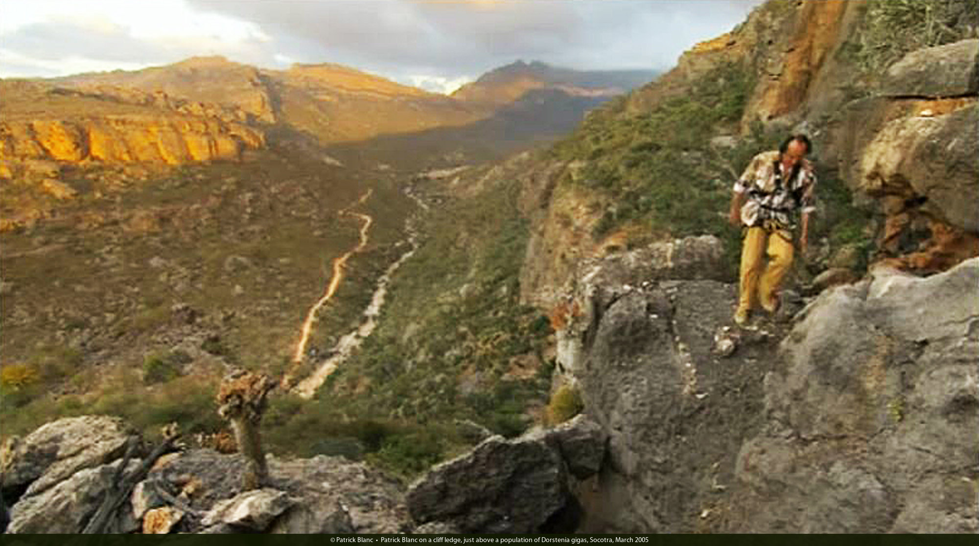 Patrick Blanc on a cliff ledge, just above a population of Dorstenia gigas, Socotra, March 2005