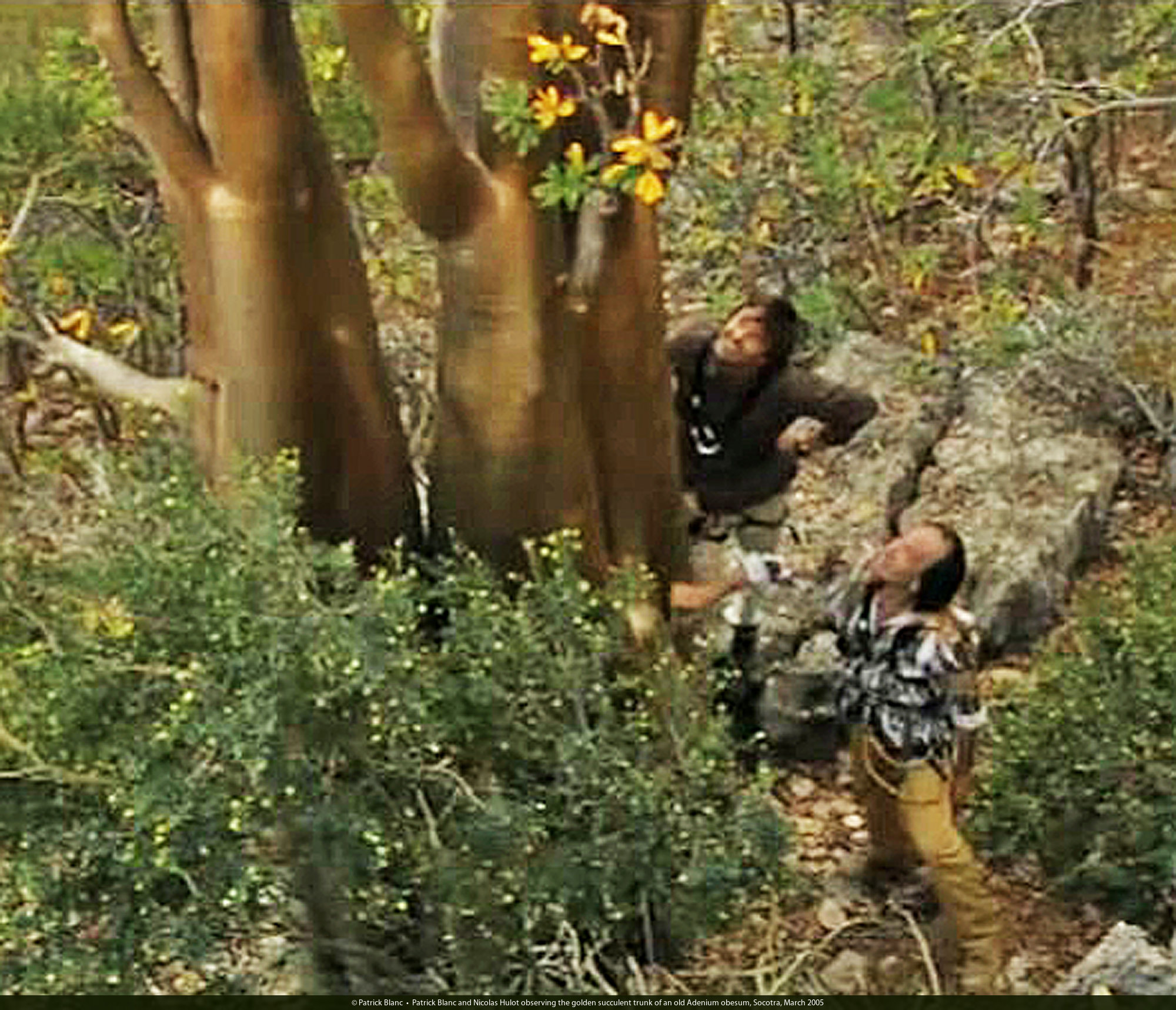 Patrick Blanc and Nicolas Hulot observing the golden succulent trunk of an old Adenium obesum, Socotra, March 2005