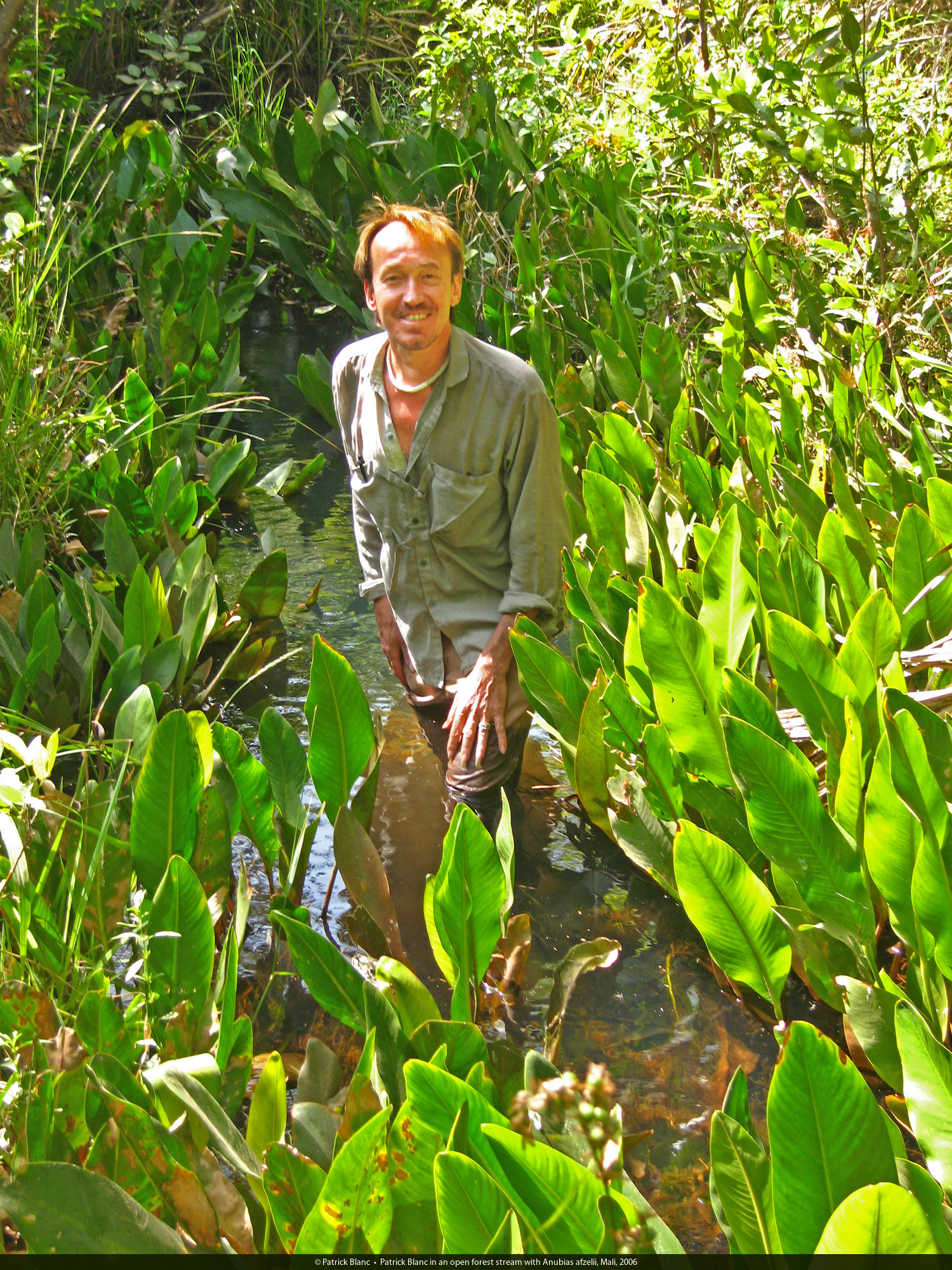 Patrick Blanc in an open forest stream with Anubias afzelii, Mali, Jan. 2006