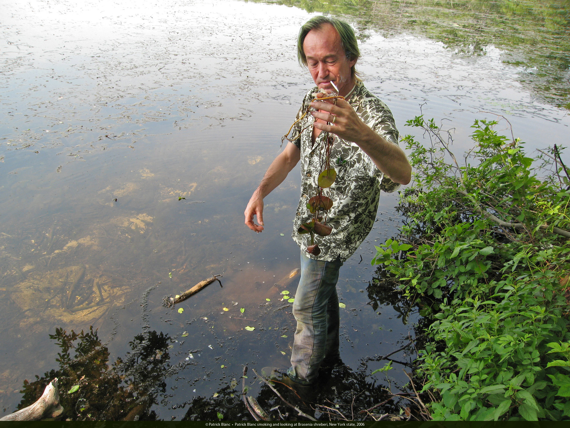 Patrick Blanc smoking and looking at Brasenia shreberi, New York state, July 2006