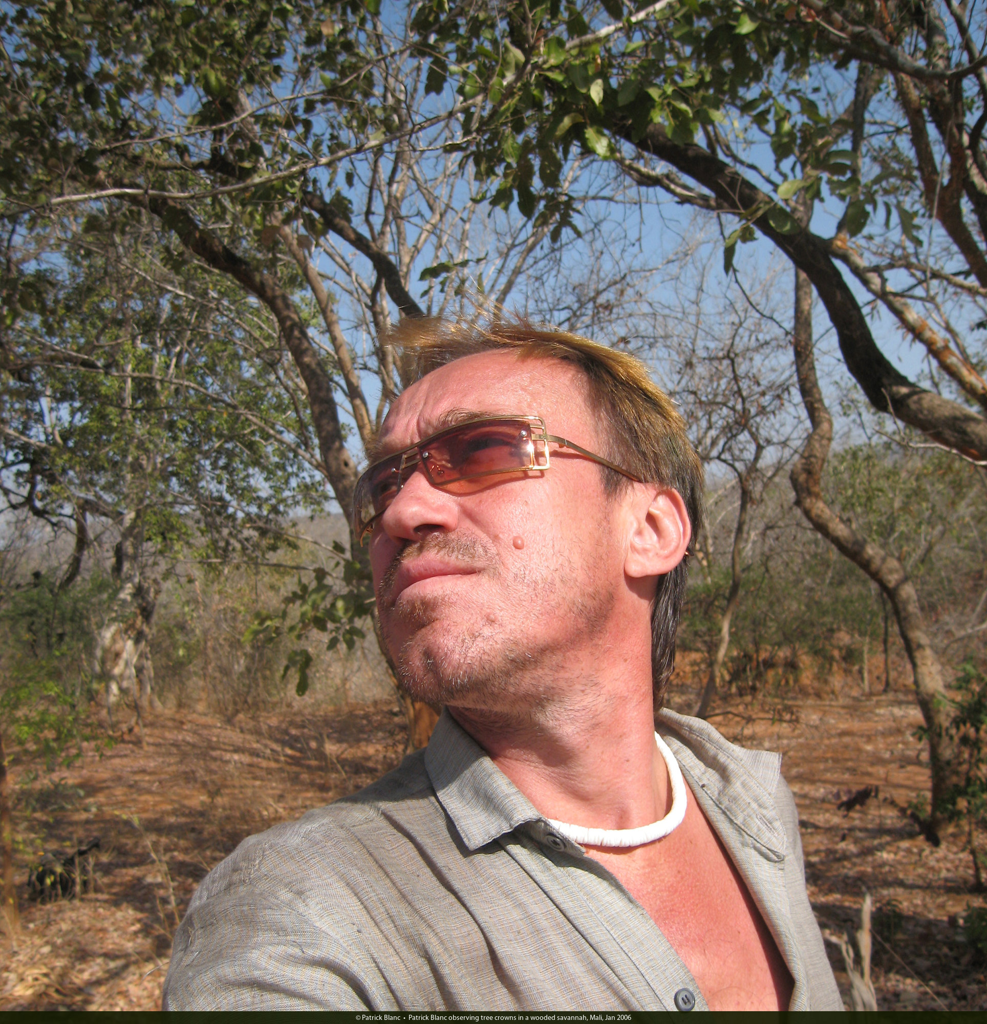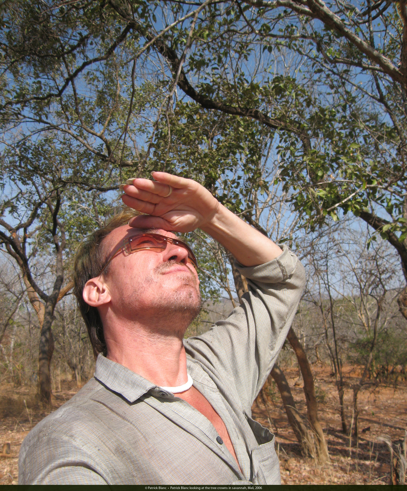Patrick Blanc looking at the tree crowns in savannah, Mali, Jan. 2006