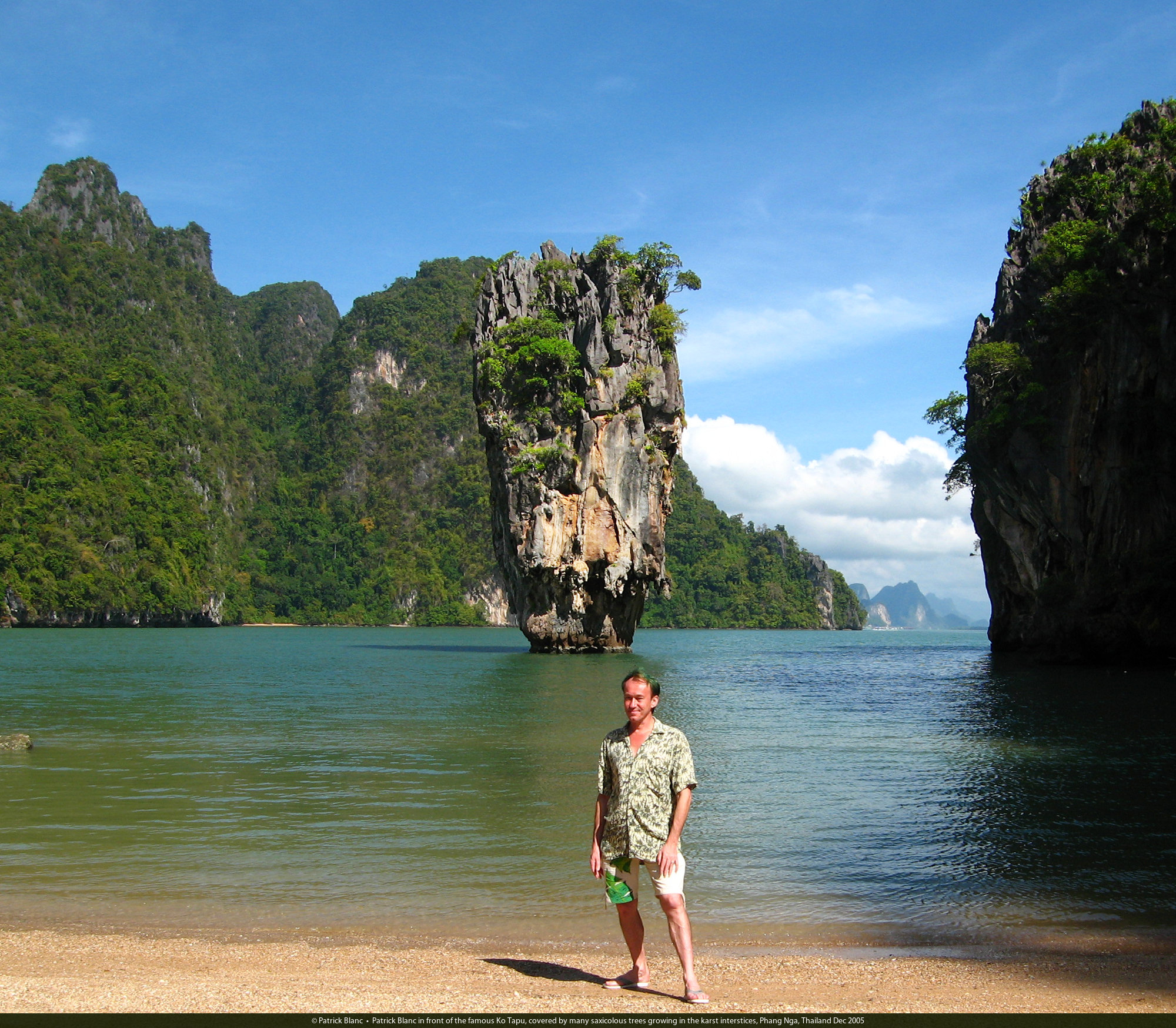 Patrick Blanc in front of the famous Ko Tapu, covered by many saxicolous trees growing in the karst interstices, Phang Nga, Thailand Dec 2005