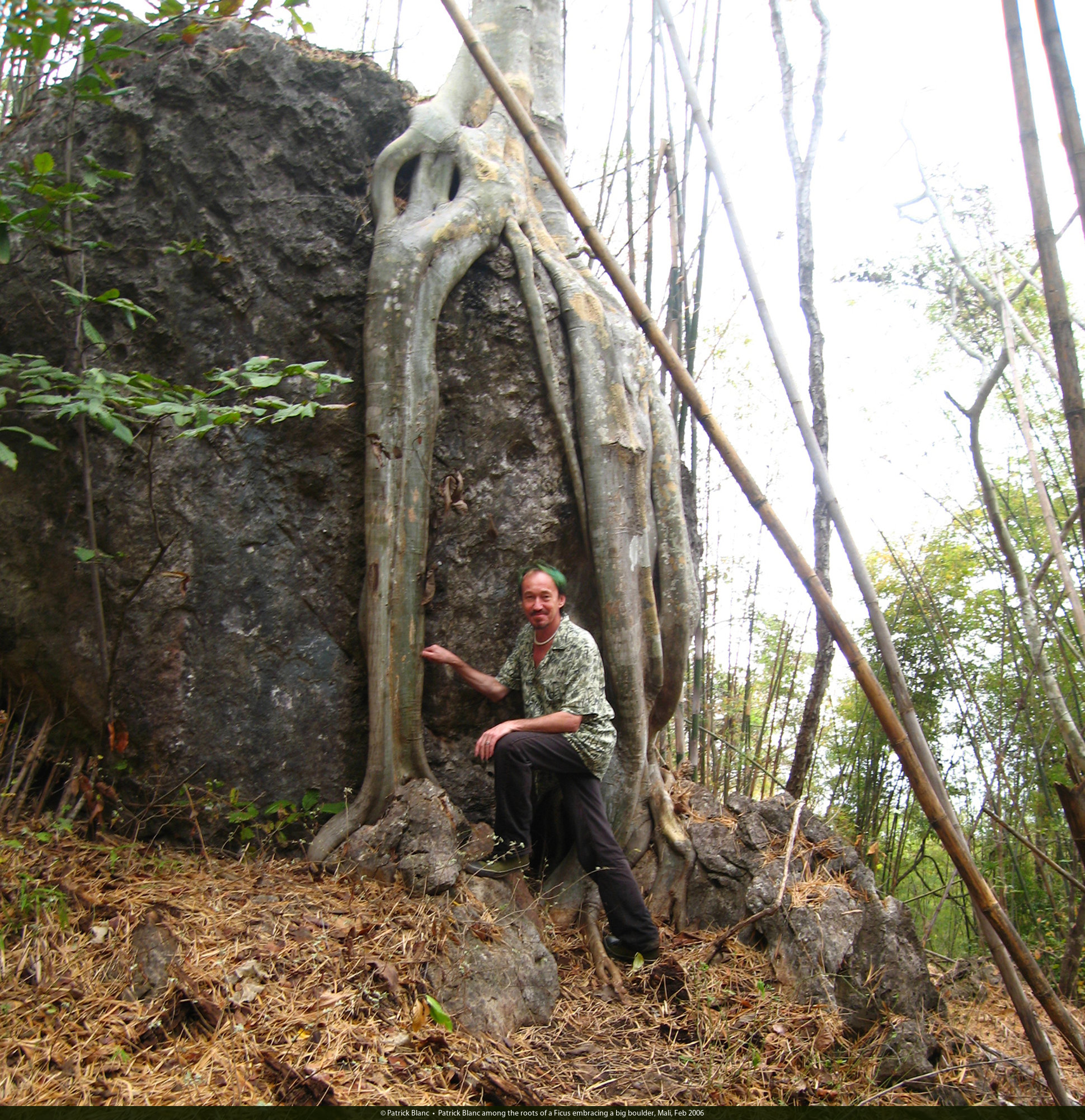 Patrick Blanc among the roots of a Ficus embracing a big boulder, Mali, Feb 2006