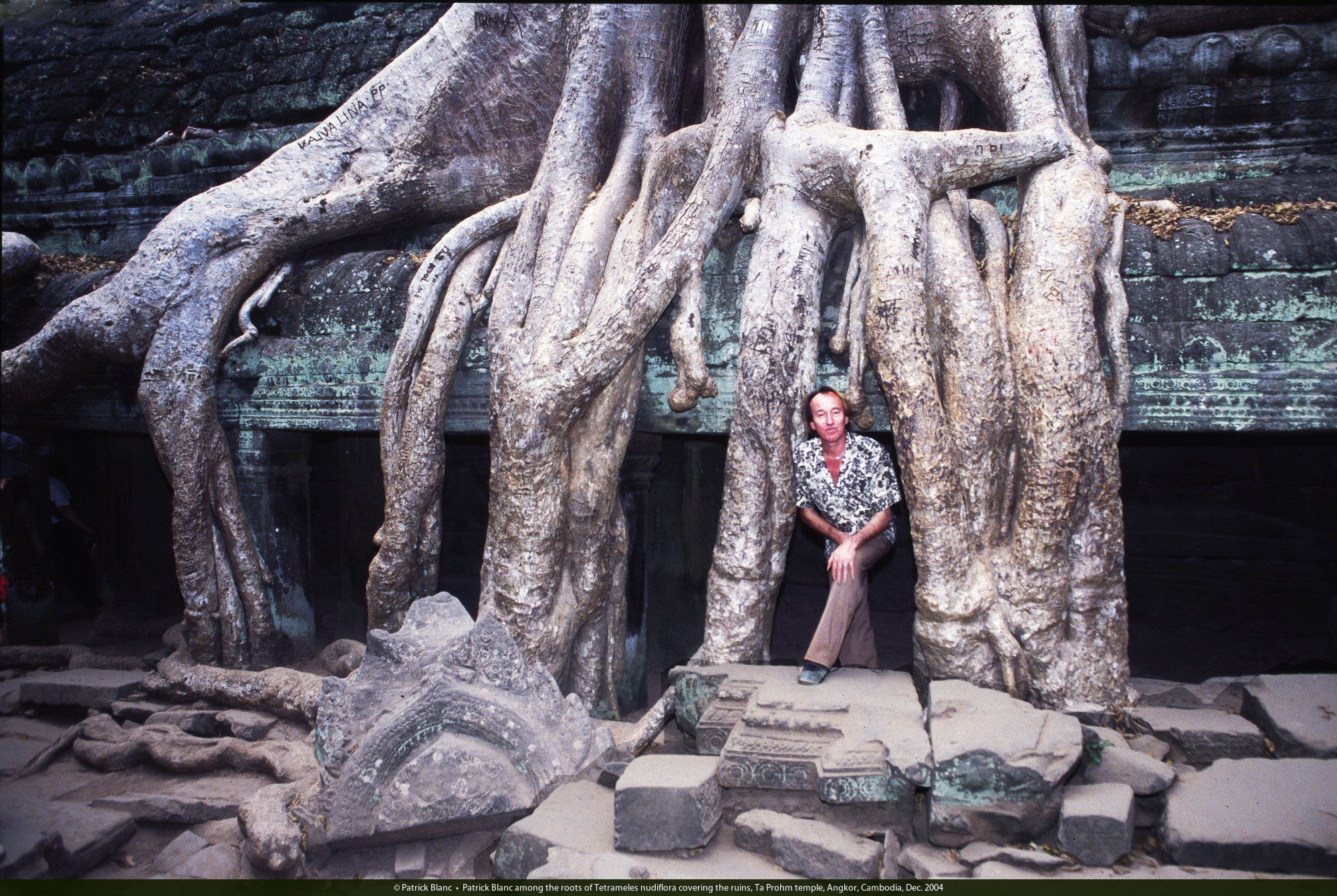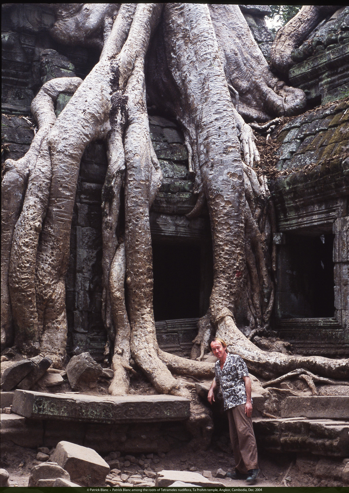 Patrick Blanc under the roots of the famous Tetrameles nudiflora, Ta Phrom, Siem Reap, Cambodia, Dec. 2004
