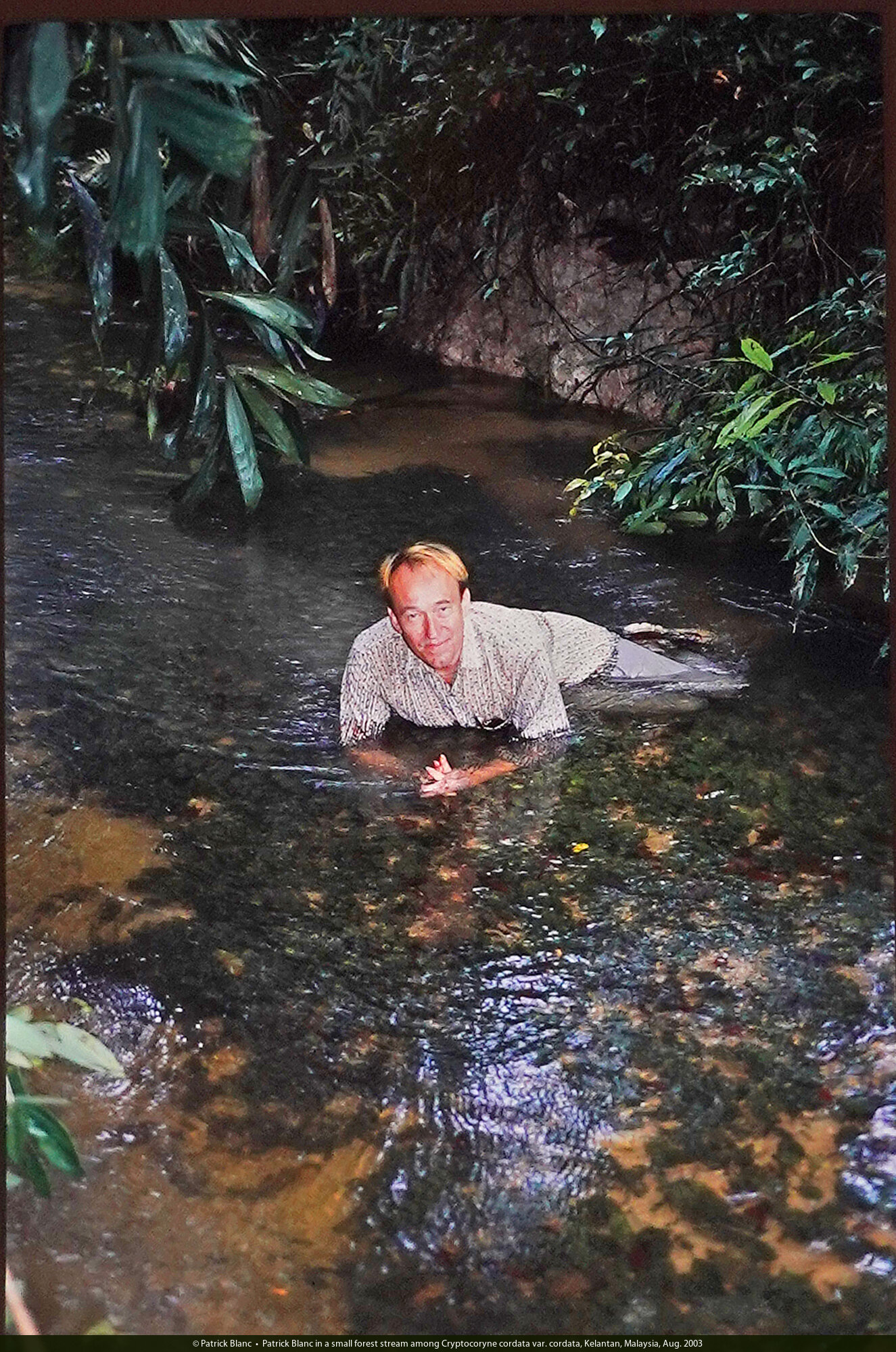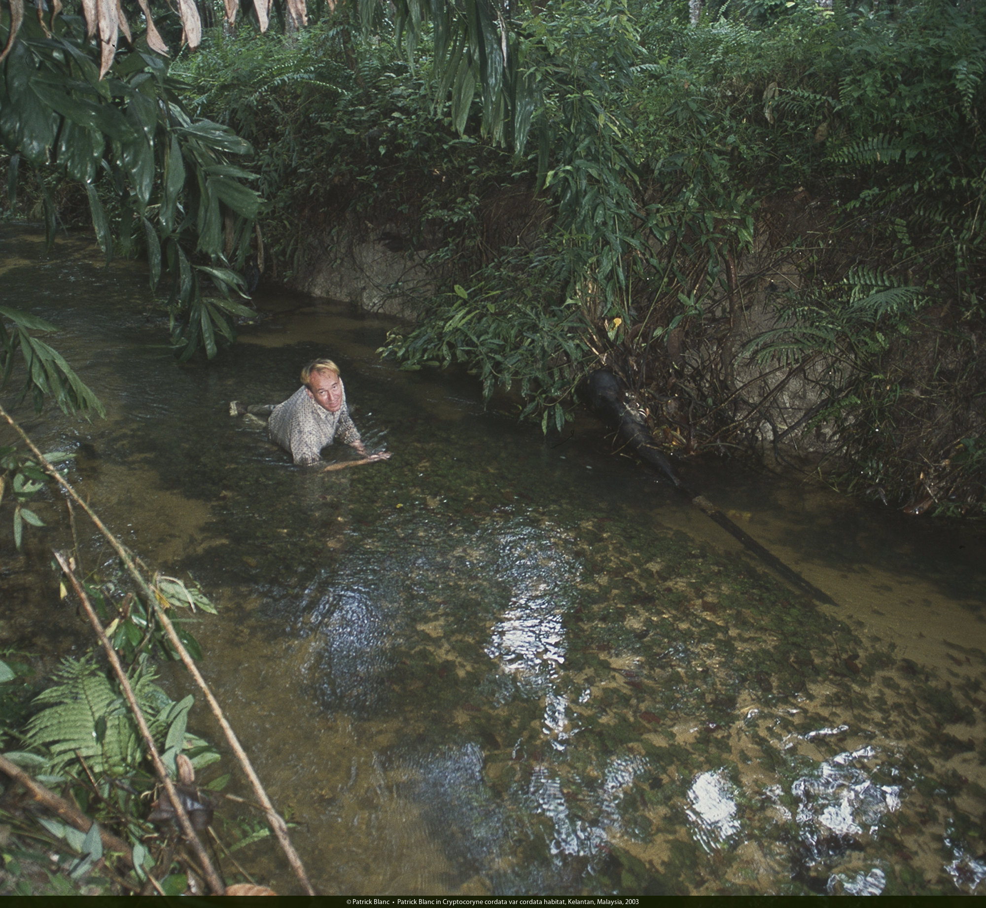 Patrick Blanc in Cryptocoryne cordata var cordata habitat, Kelantan, Malaysia, 2003, photo by Gilles Deparis
