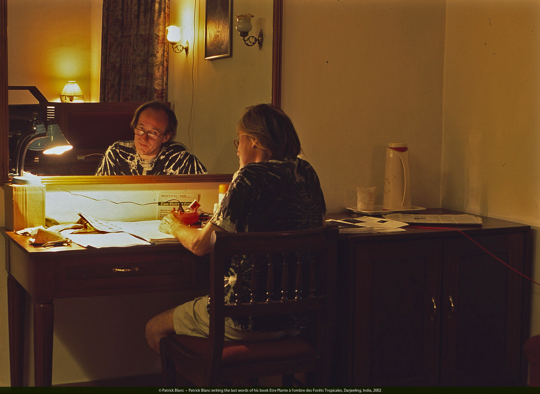 Patrick Blanc writing the last pages of his book Etre Plante, Darjeeling, Sept. 2002