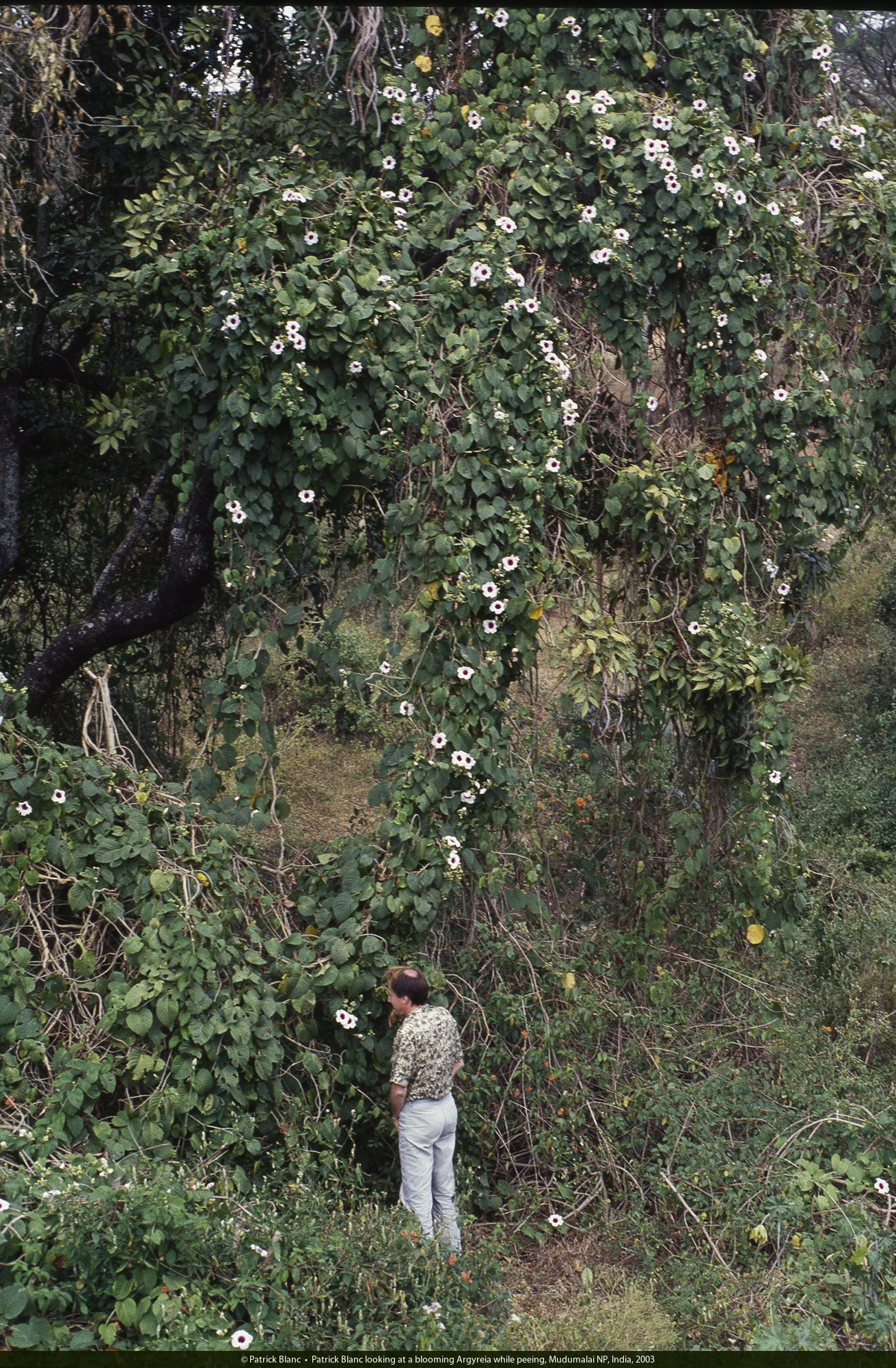 Patrick Blanc looking at a blooming Argyreia while peeing, Mudumalai NP, India, July 2003