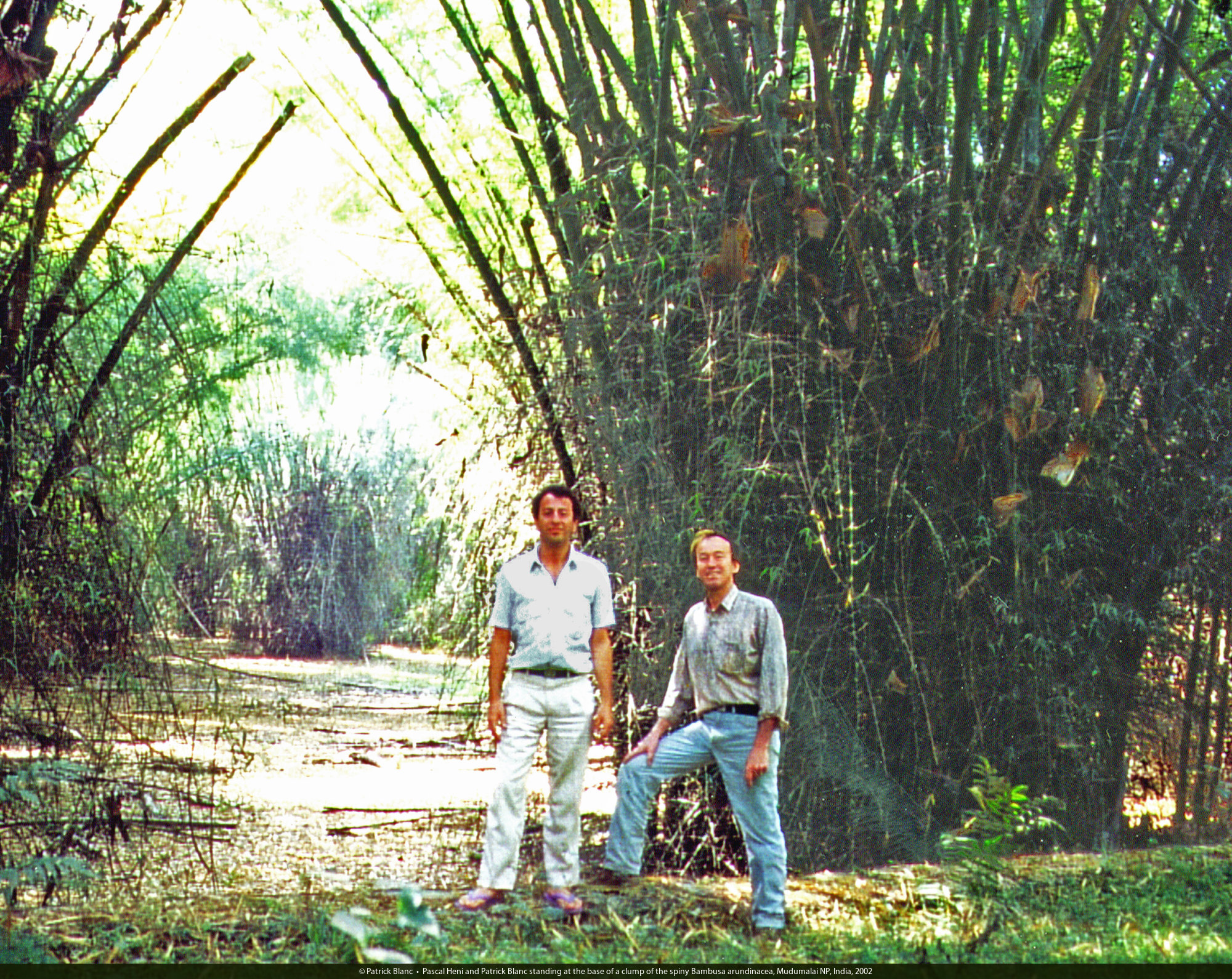 Pascal Heni and Patrick Blanc standing at the base of a clump of the spiny Bambusa arundinacea, Mudumalai NP, India, Sept. 2002