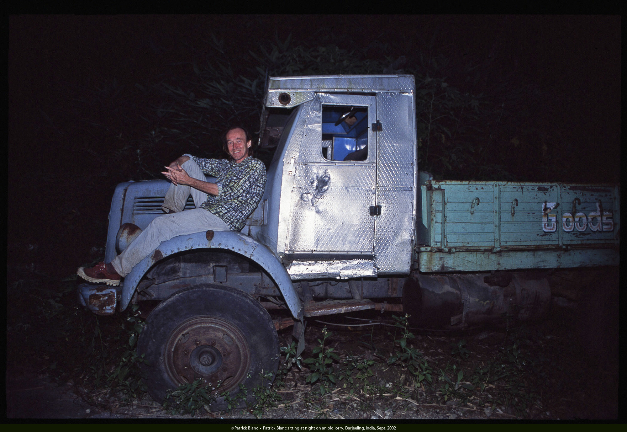 Patrick Blanc sitting at night on an old lorry, Darjeeling, India, Sept. 2002