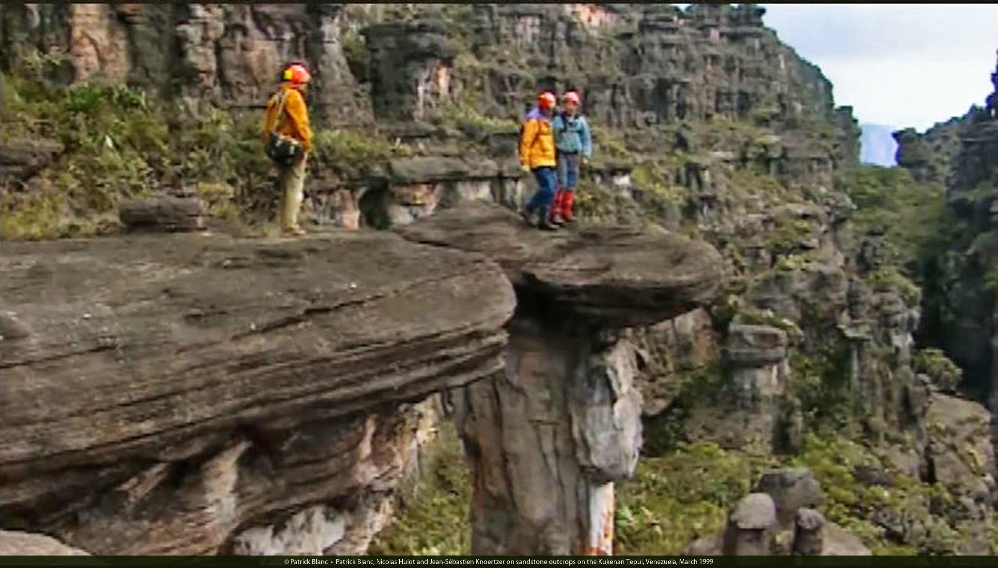Patrick Blanc, Nicolas Hulot and Jean-Sébastien Knoertzer on sandstone outcrops on the Kukenan Tepui, Venezuela, March 1999