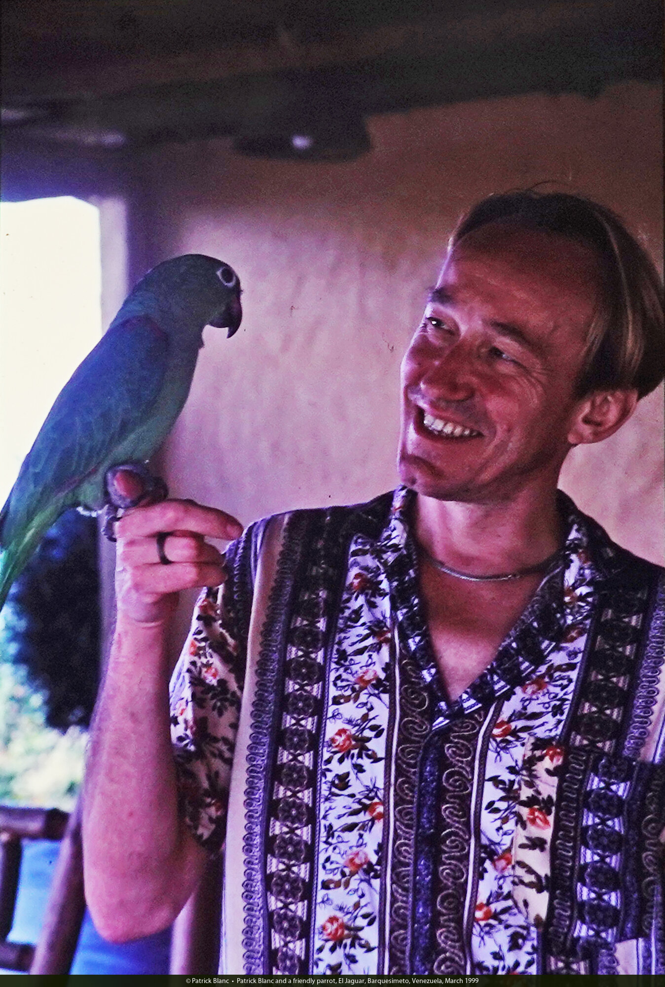 Patrick Blanc and a friendly parrot, El Jaguar, Barquesimeto, Venezuela, March 1999