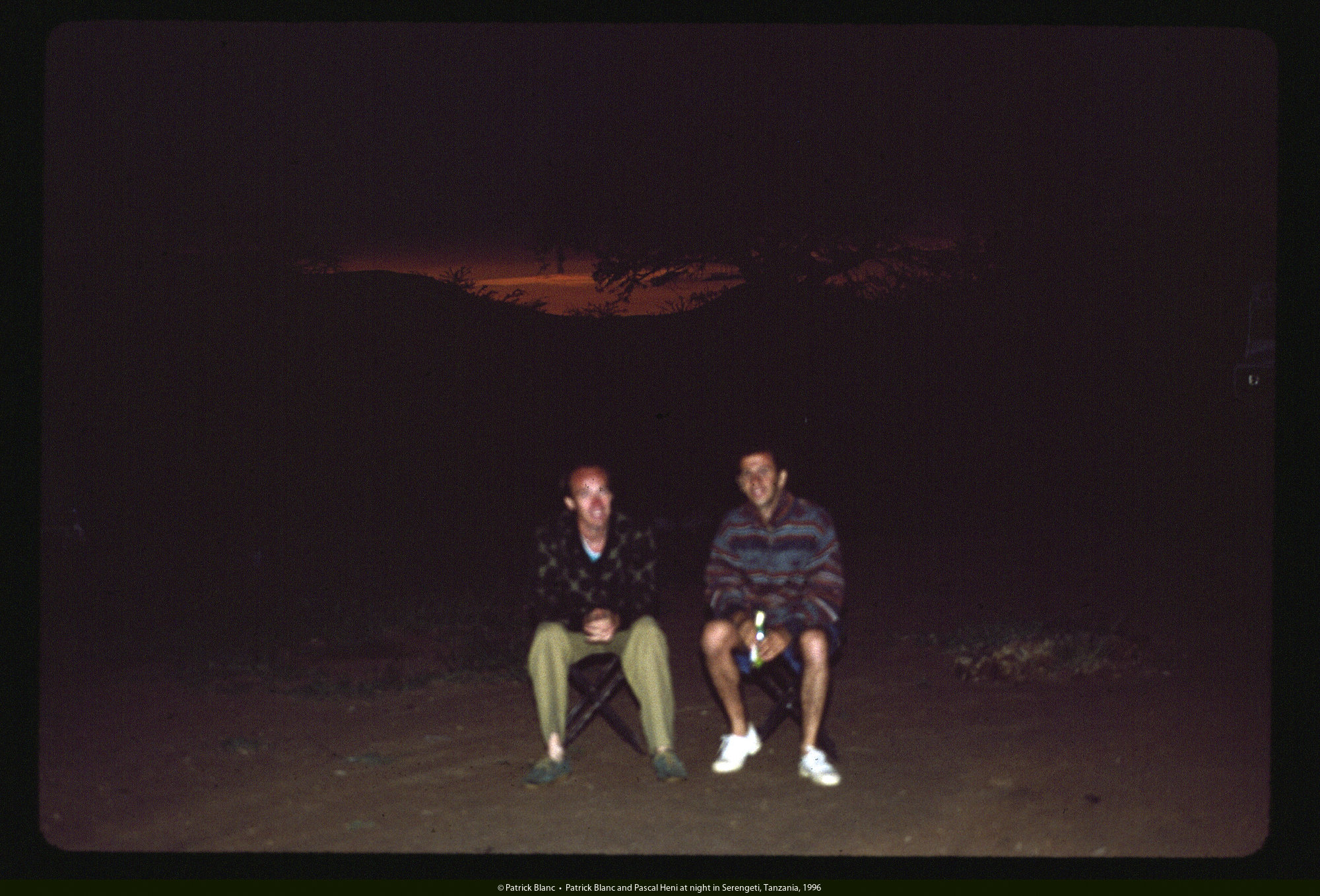 Patrick Blanc and Pascal Heni at night in Serengeti, Tanzania, 1996