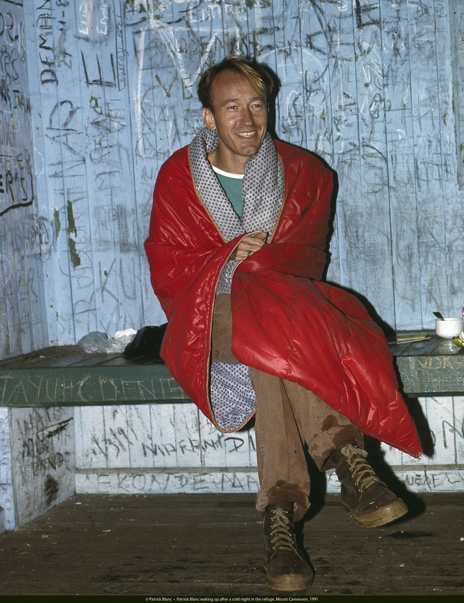 Patrick Blanc waking up after a cold night in the refuge, Mount Cameroon, 1991