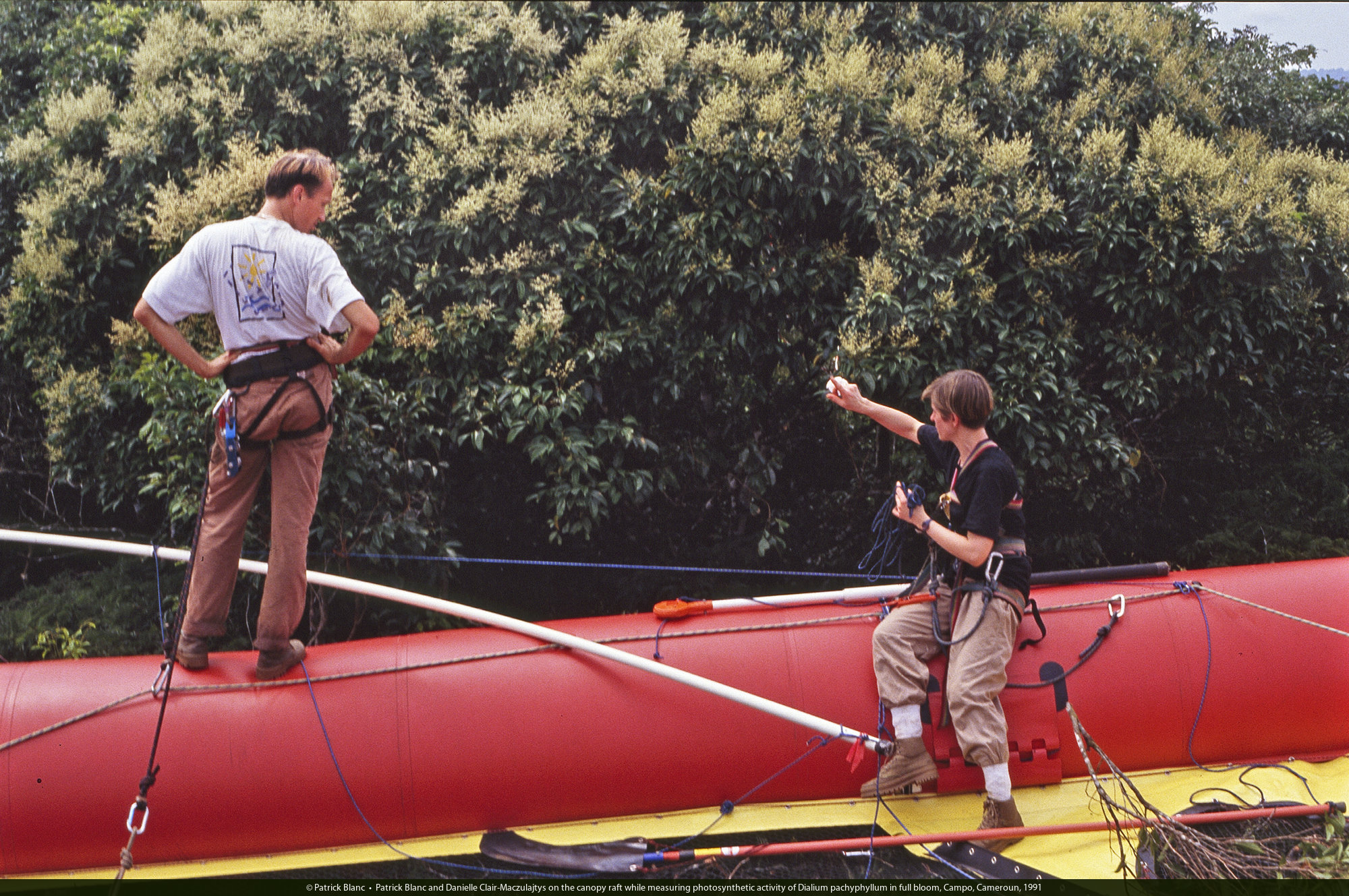 Patrick Blanc and Danielle Clair-Maczulajtys on the Radeau des Cimes, canopy raft while measuring photosynthetic activity of Dialium pachyphyllum in full bloom, Campo, Cameroun, 1991