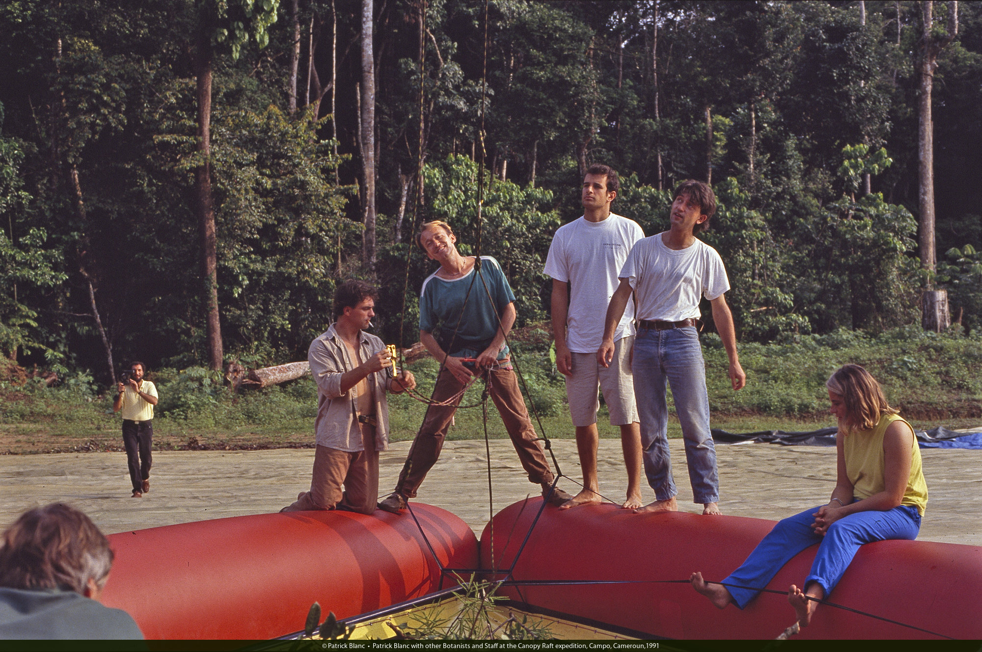 Patrick Blanc with other Botanists and Staff at the Radeau des Cimes, Canopy Raft expedition, Campo, Cameroun,1991