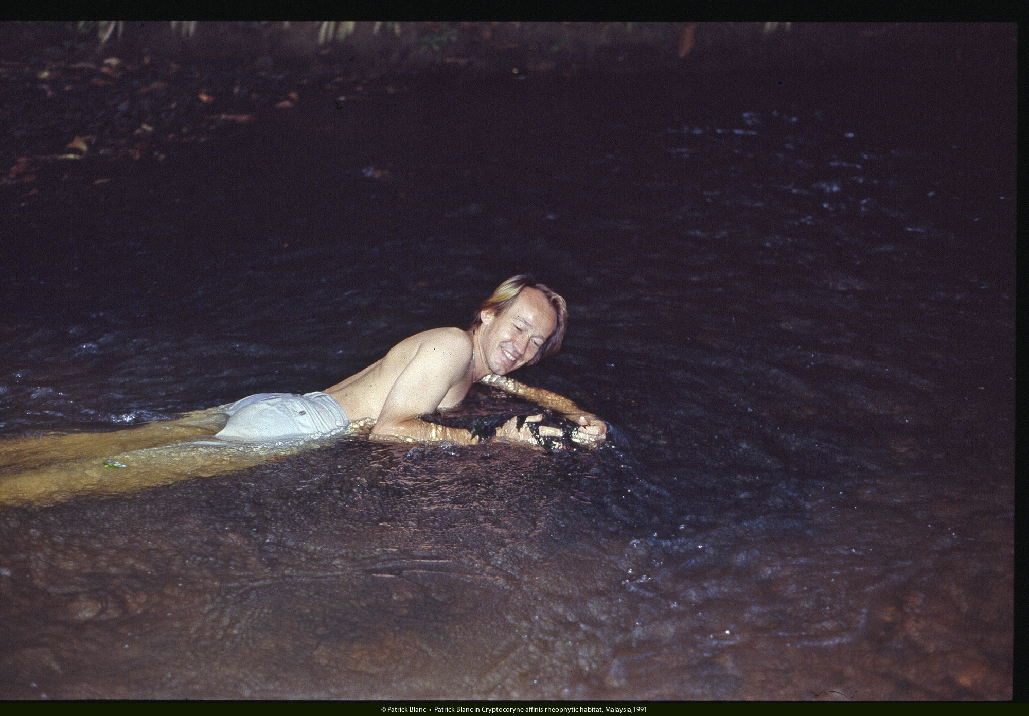 Patrick Blanc in Cryptocoryne affinis rheophytic habitat, Taman negara, Malaysia, Aug. 1991