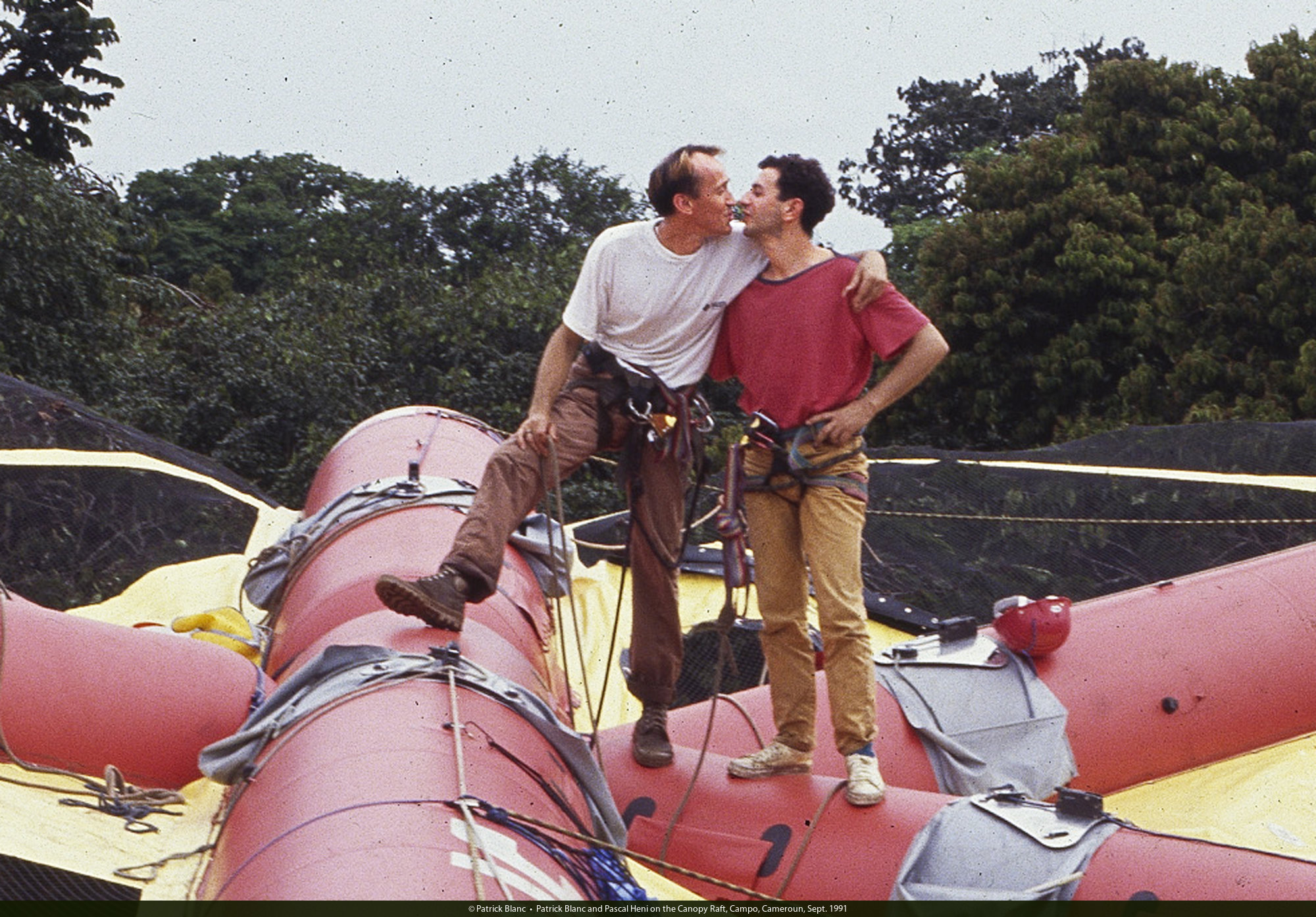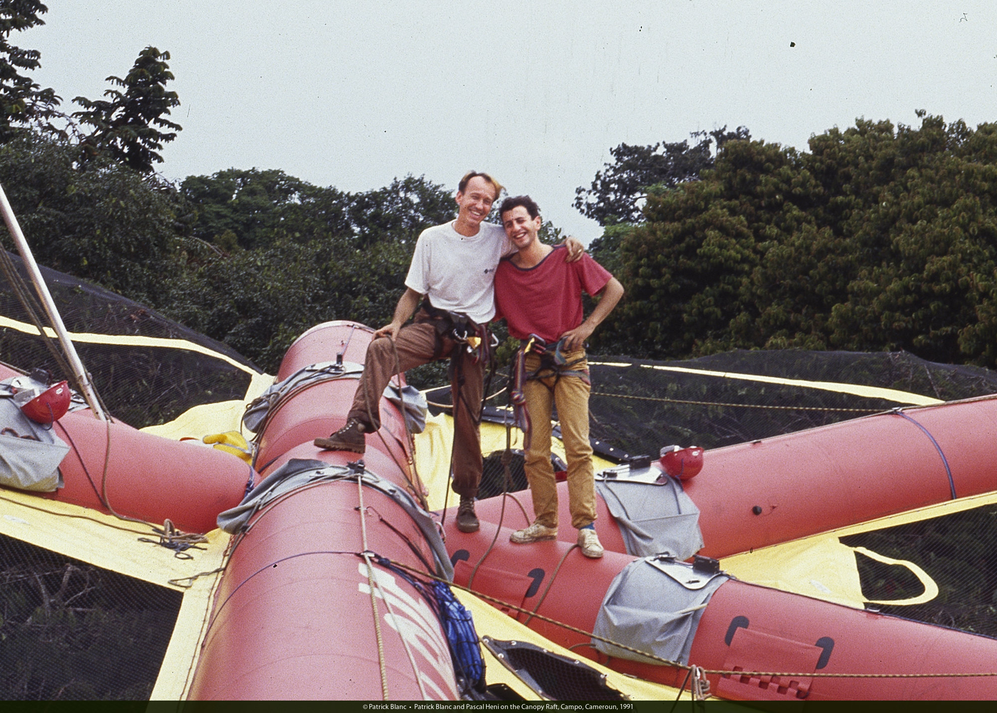 Patrick Blanc and Pascal Heni on the Radeau des Cimes, Canopy Raft, Campo, Cameroun, 1991