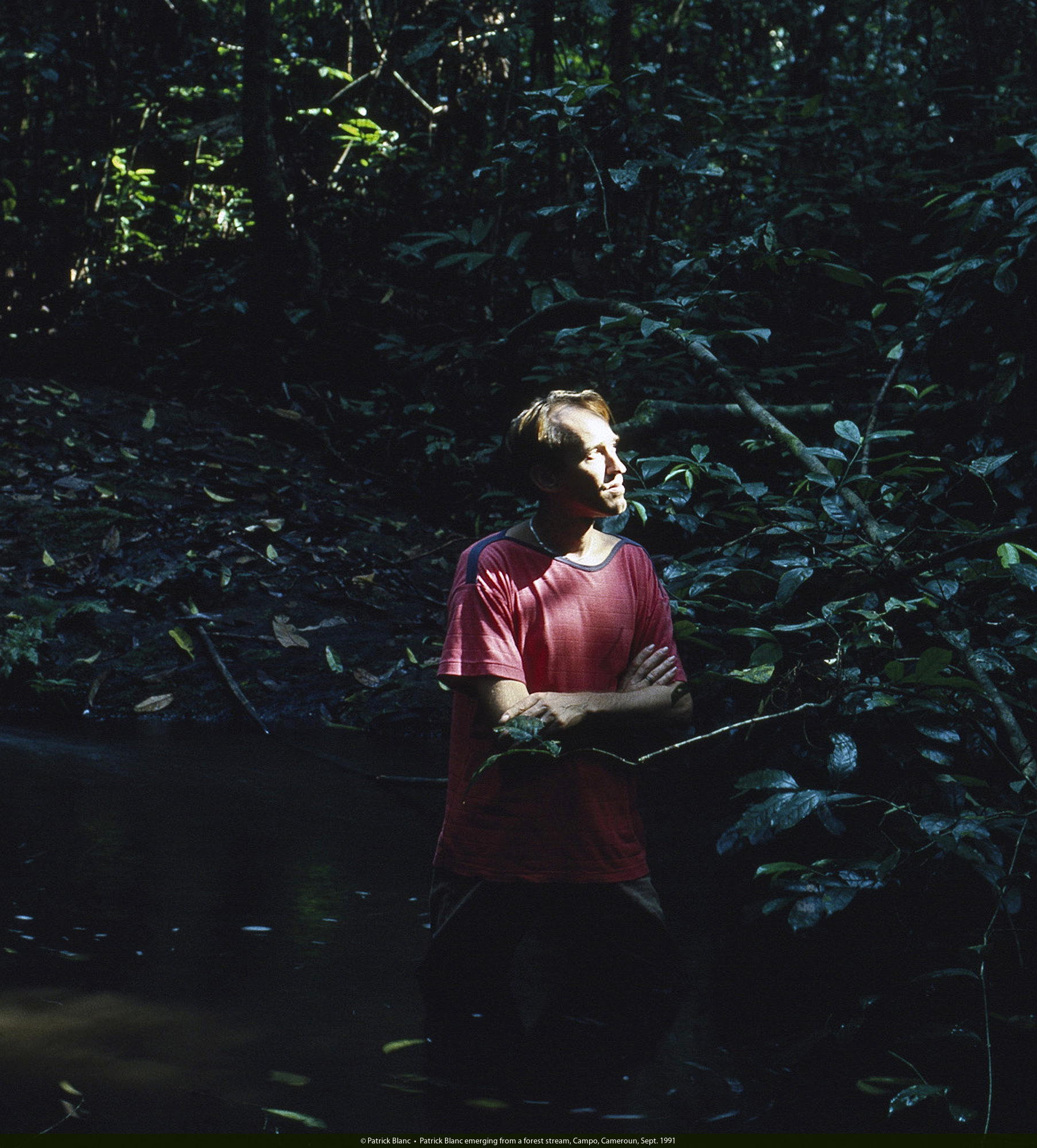 Patrick Blanc emerging from a forest stream, Campo, Cameroun, Sept. 1991