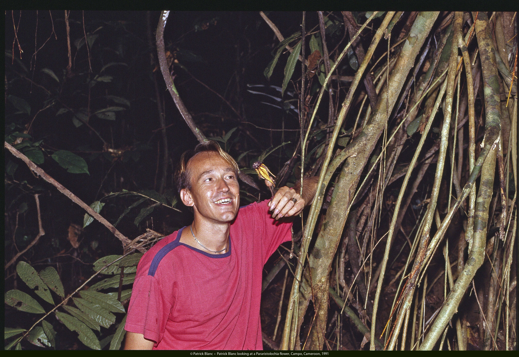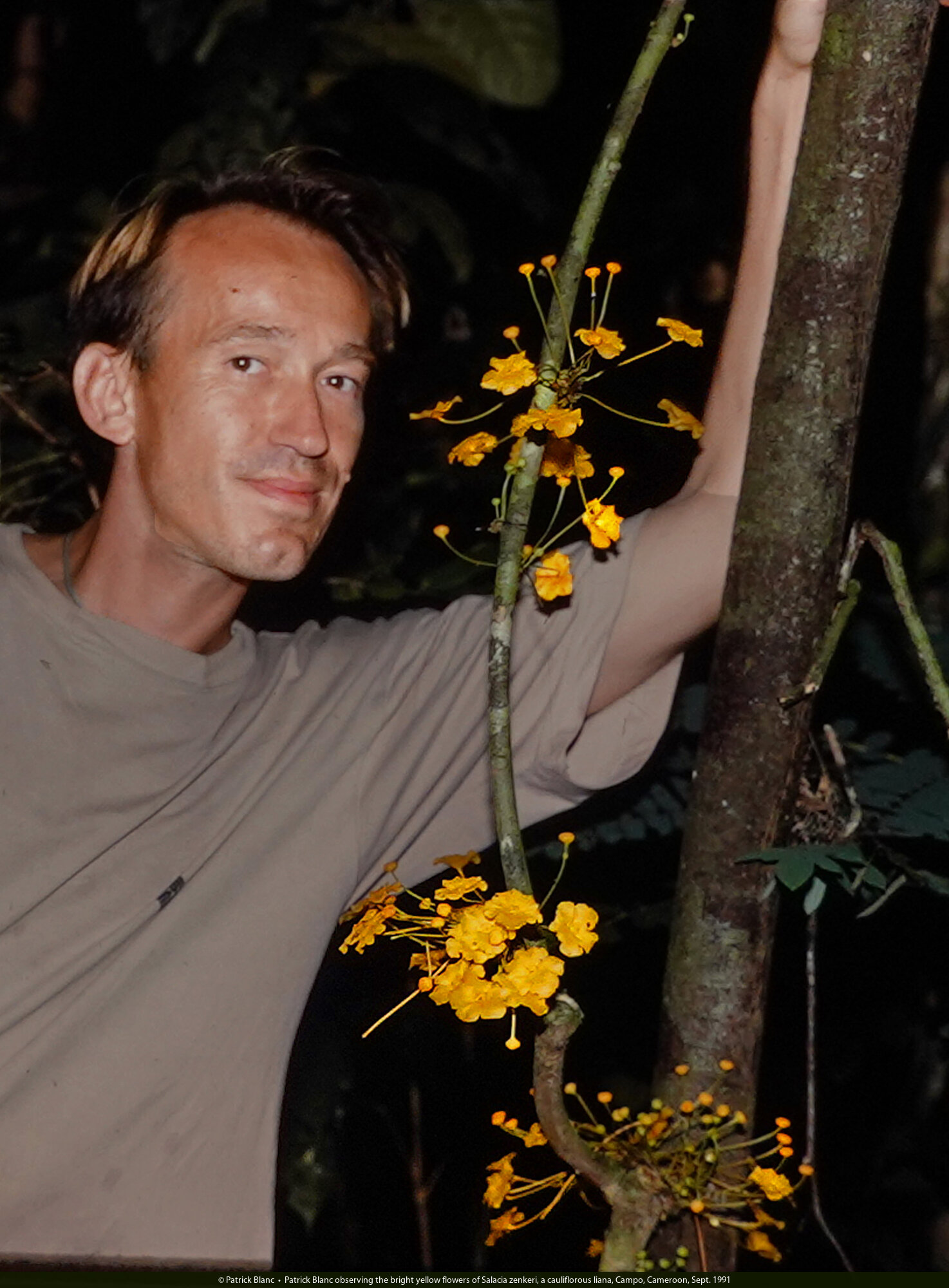 Patrick Blanc observing the bright yellow flowers of Salacia zenkeri, a cauliflorous liana, Campo, Cameroon, Sept. 1991