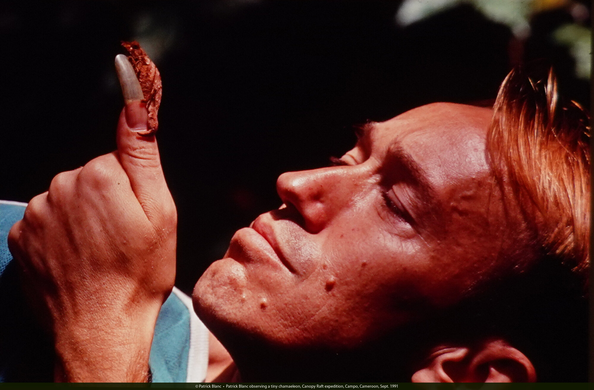 Patrick Blanc observing a tiny chamaeleon, Canopy Raft expedition, Campo, Cameroon, Sept. 1991