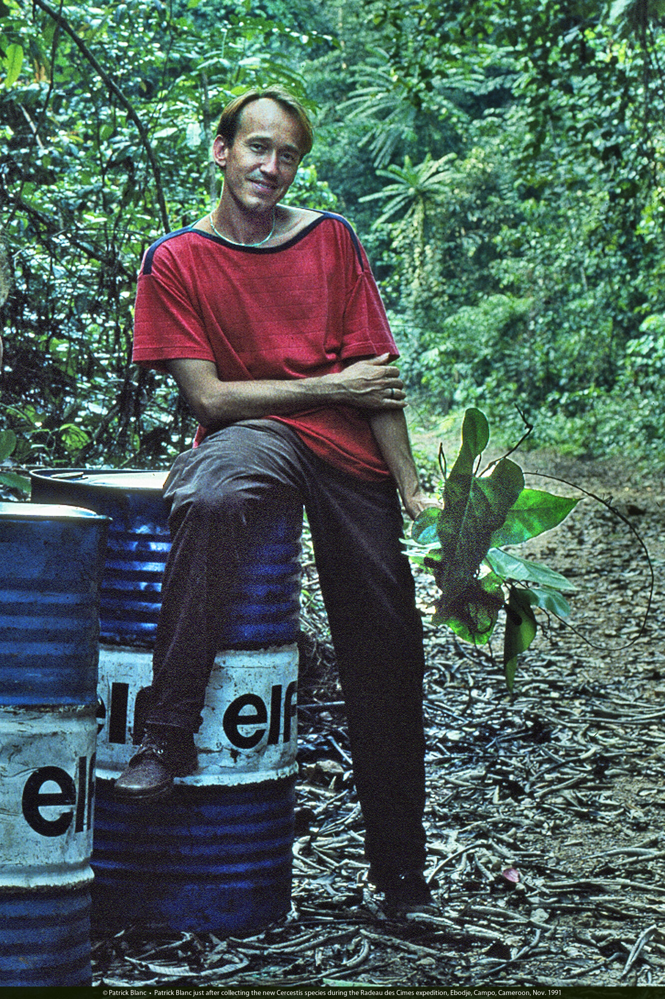 Patrick Blanc just after collecting the new Cercestis species during the Radeau des Cimes expedition, Ebodje, Campo, Cameroon, Nov. 1991