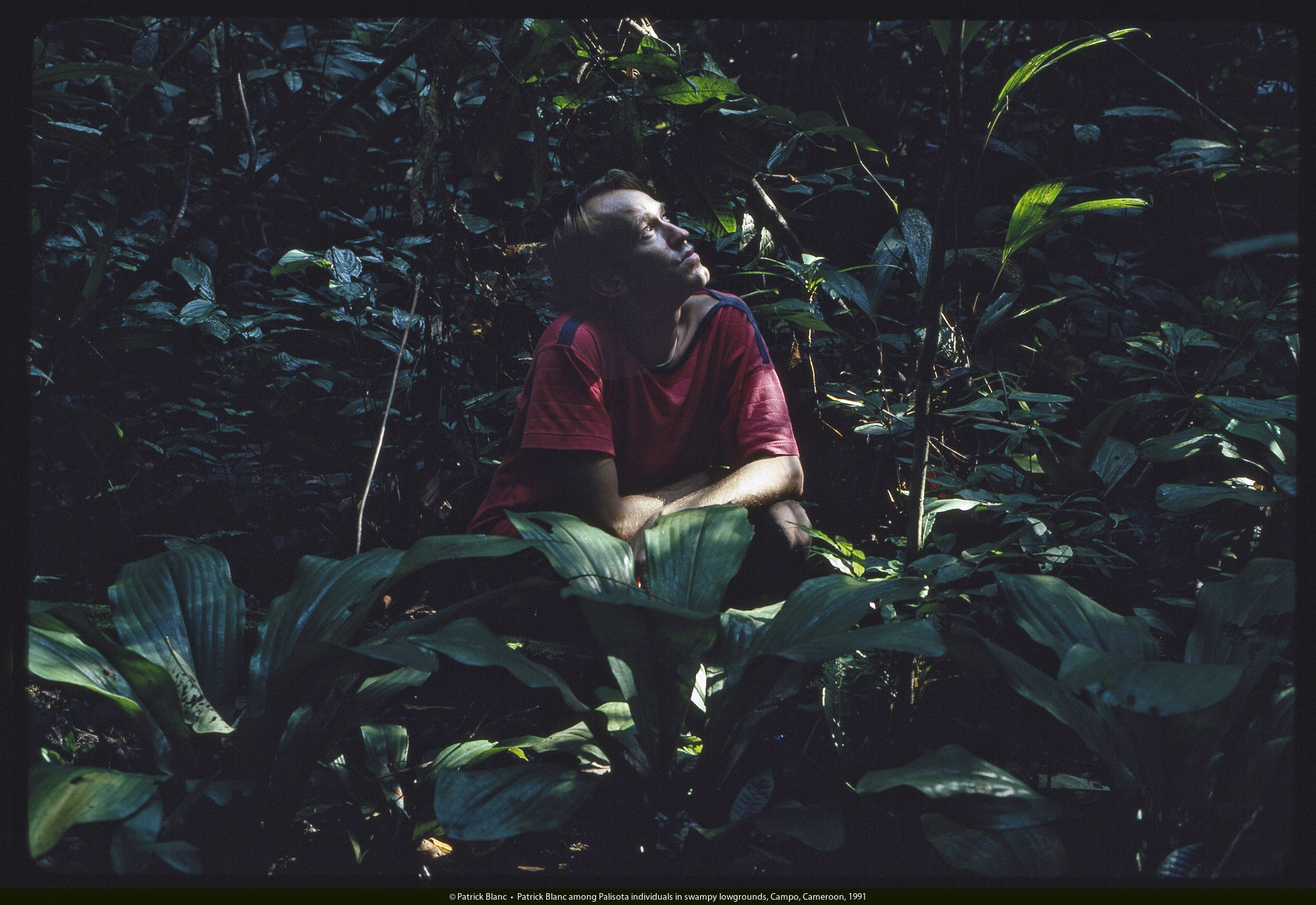 Patrick Blanc observing the monophyllous Acanthonema strigosum, Radeau des Cimes, Campo, Cameroon, Aug. 1991