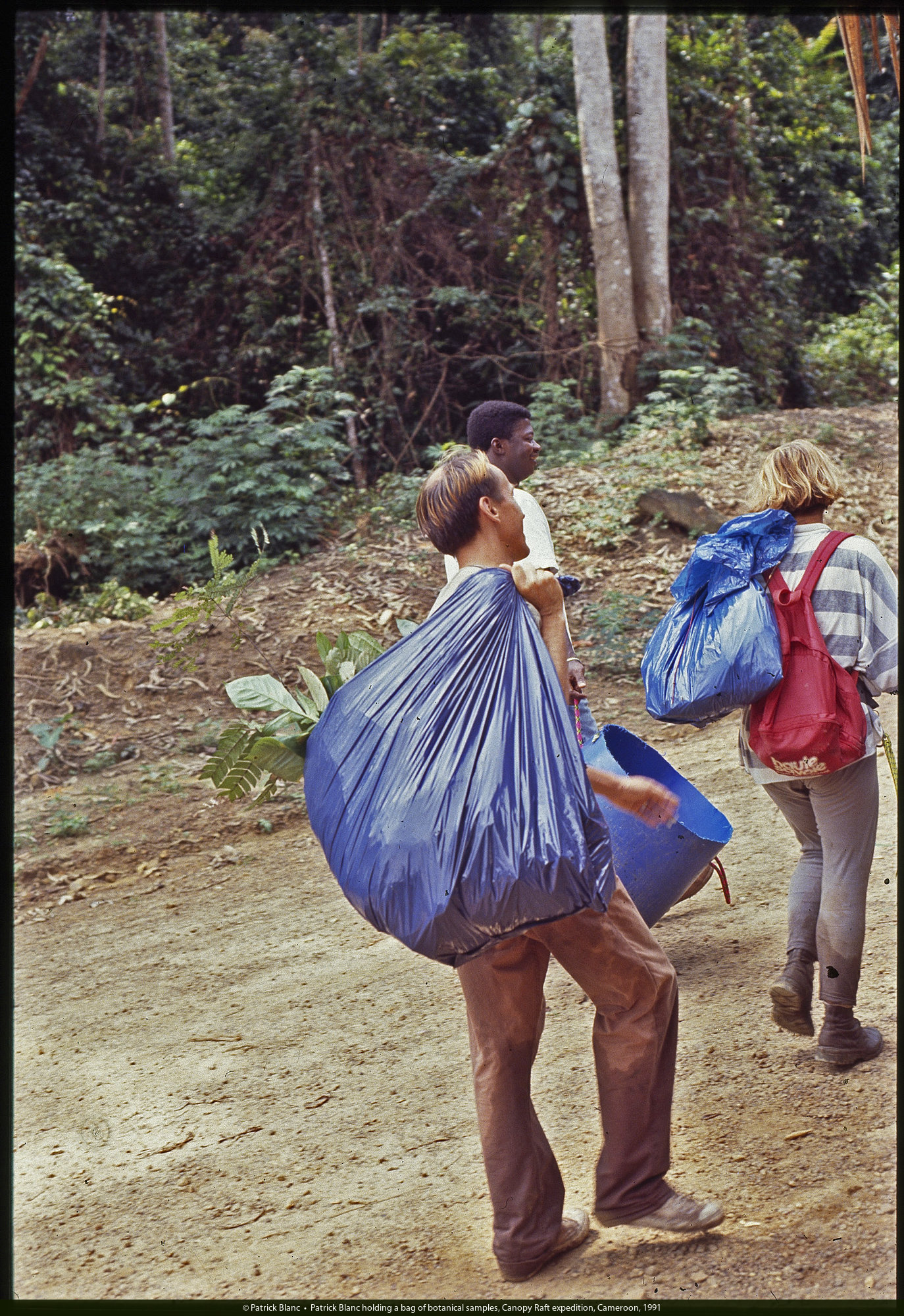 Patrick Blanc holding a bag of botanical samples, Radeau des Cimes, Canopy Raft expedition, Cameroon, 1991