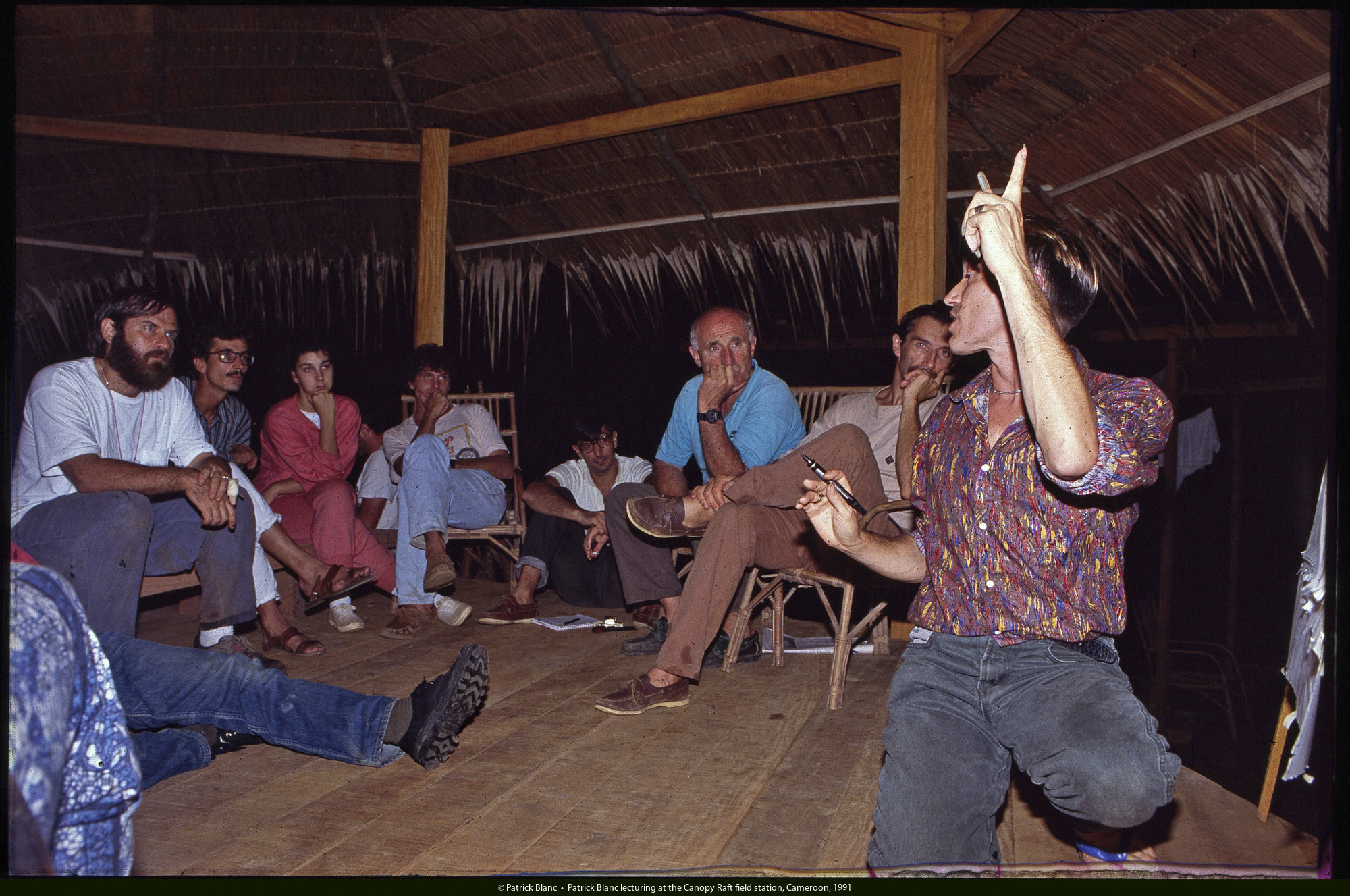 Patrick Blanc lecturing at the Radeau des Cimes, Canopy Raft field station, Cameroon, 1991
