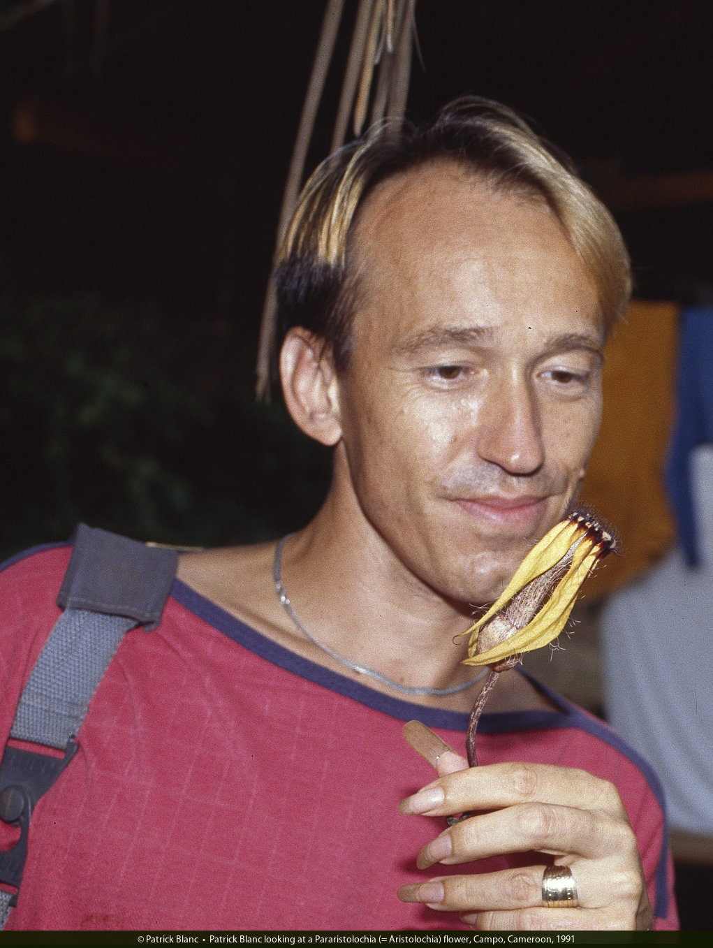 Patrick Blanc testing the Crinum natans perfume, Campo, Cameroun, 1991