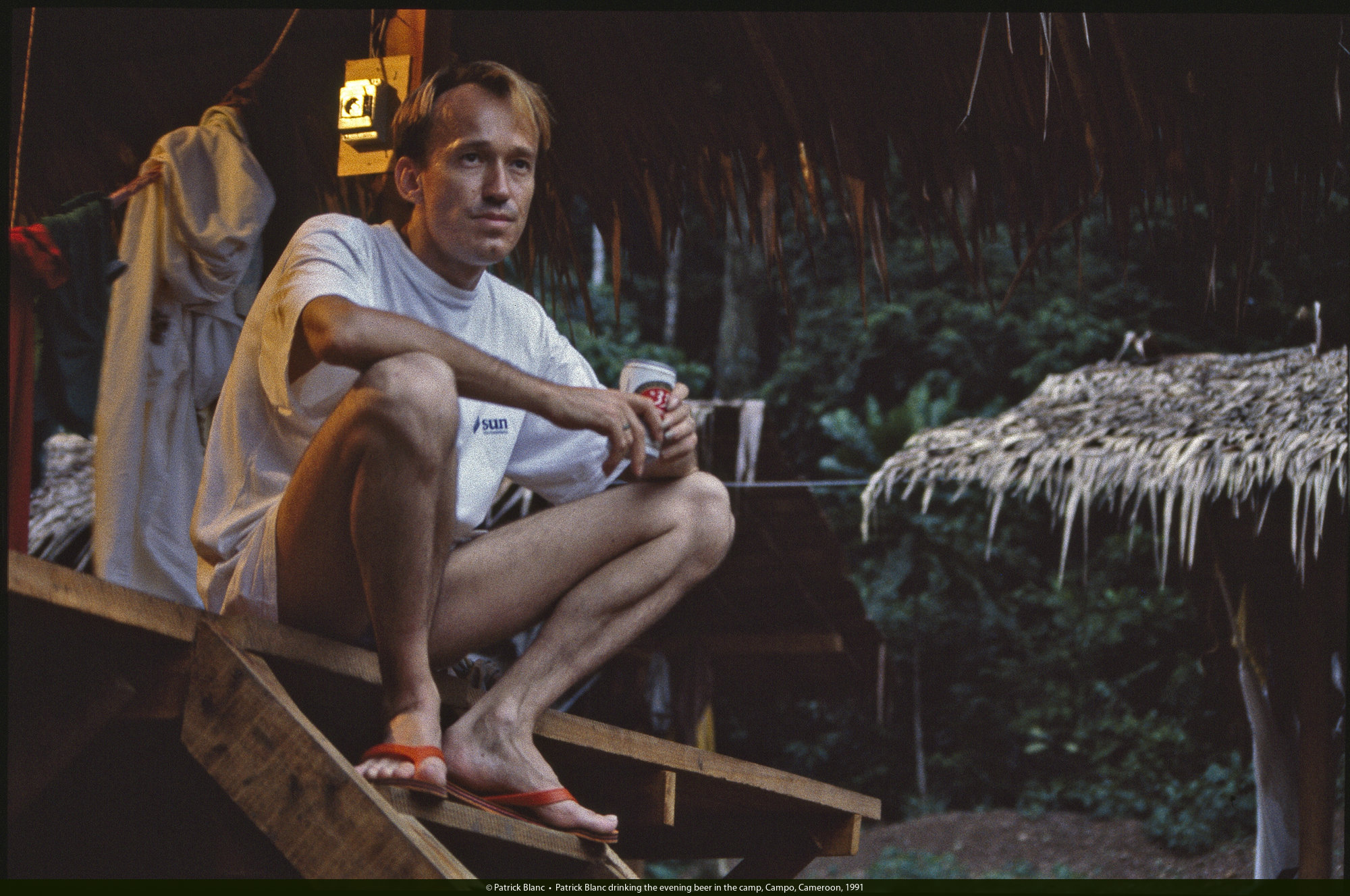 Patrick Blanc drinking the evening beer in the camp, Campo, Cameroon, 1991