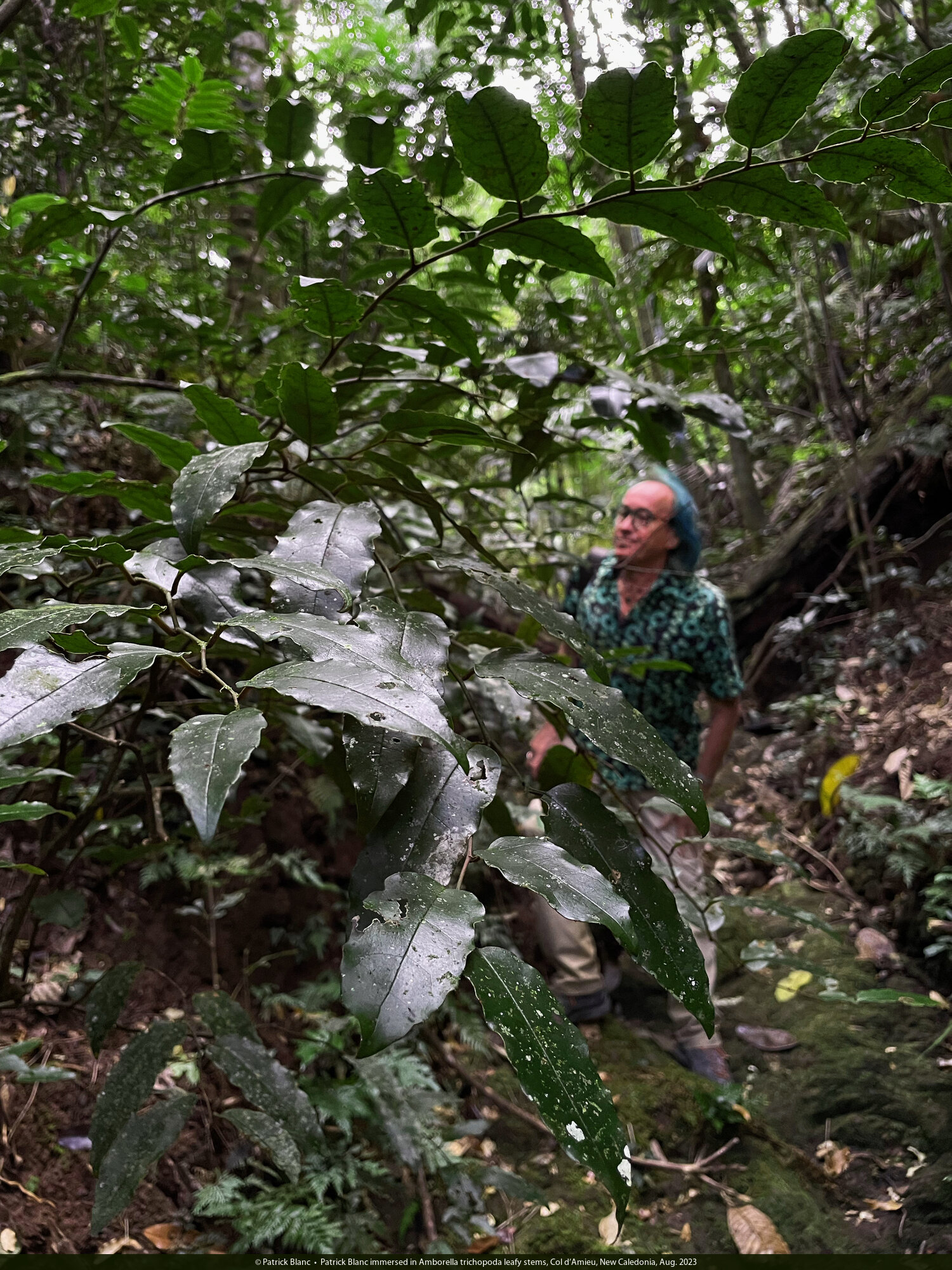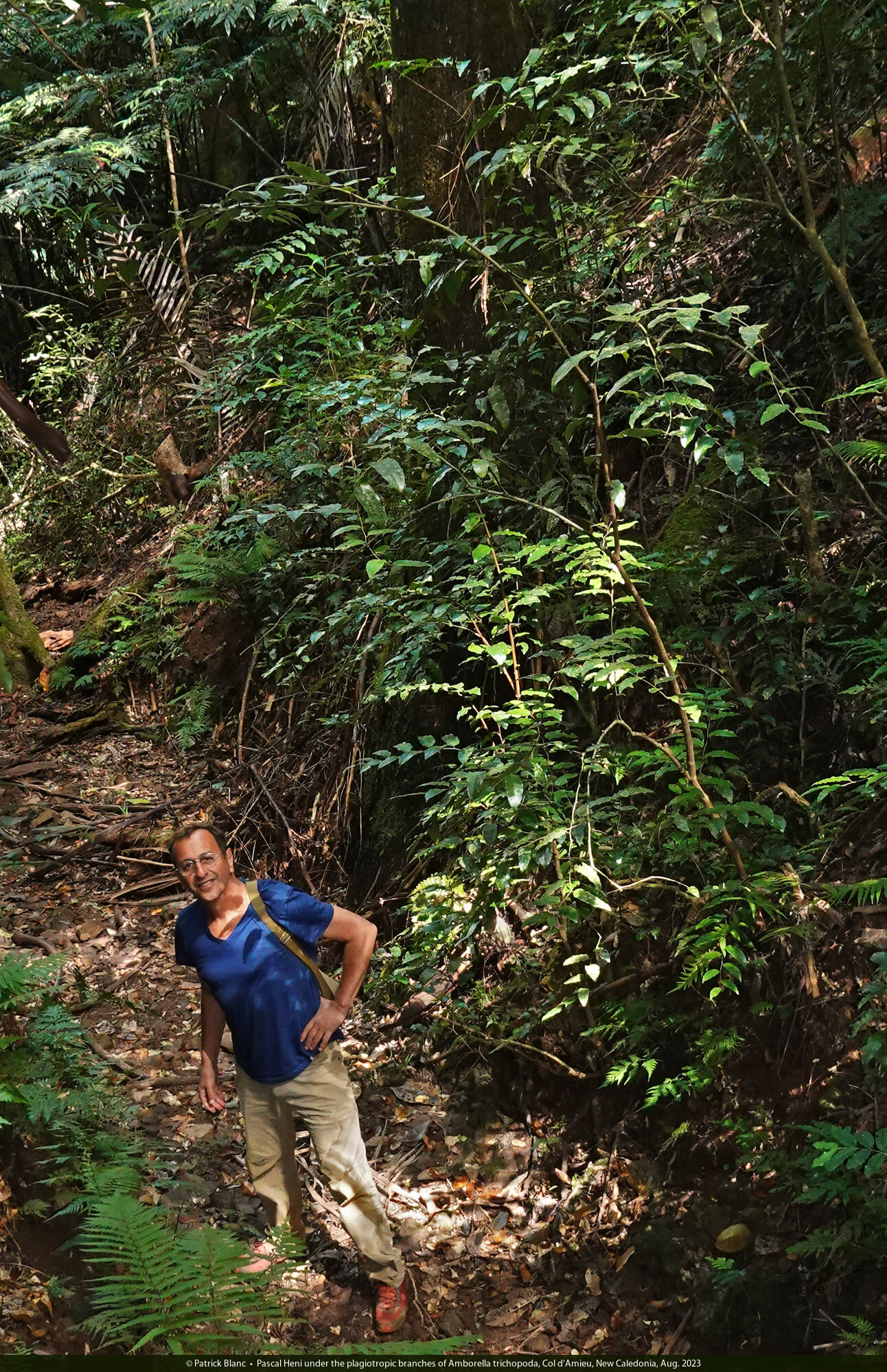 Pascal Heni under the plagiotropic branches of Amborella trichopoda, Col d'Amieu, New Caledonia, Aug. 2023