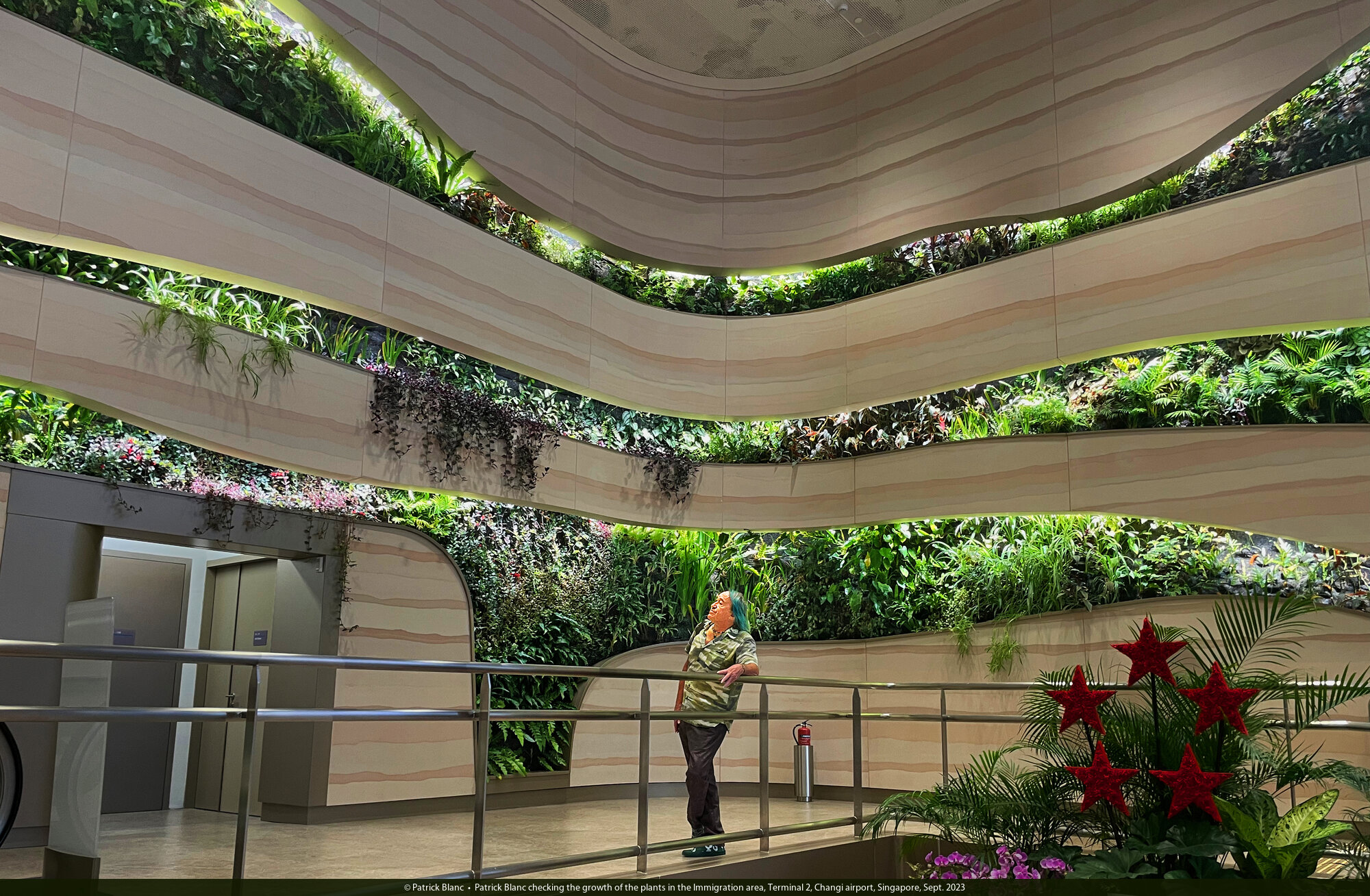 Patrick Blanc checking the growth of the plants in the Immigration area, Terminal 2, Changi airport, Singapore, Sept. 2023