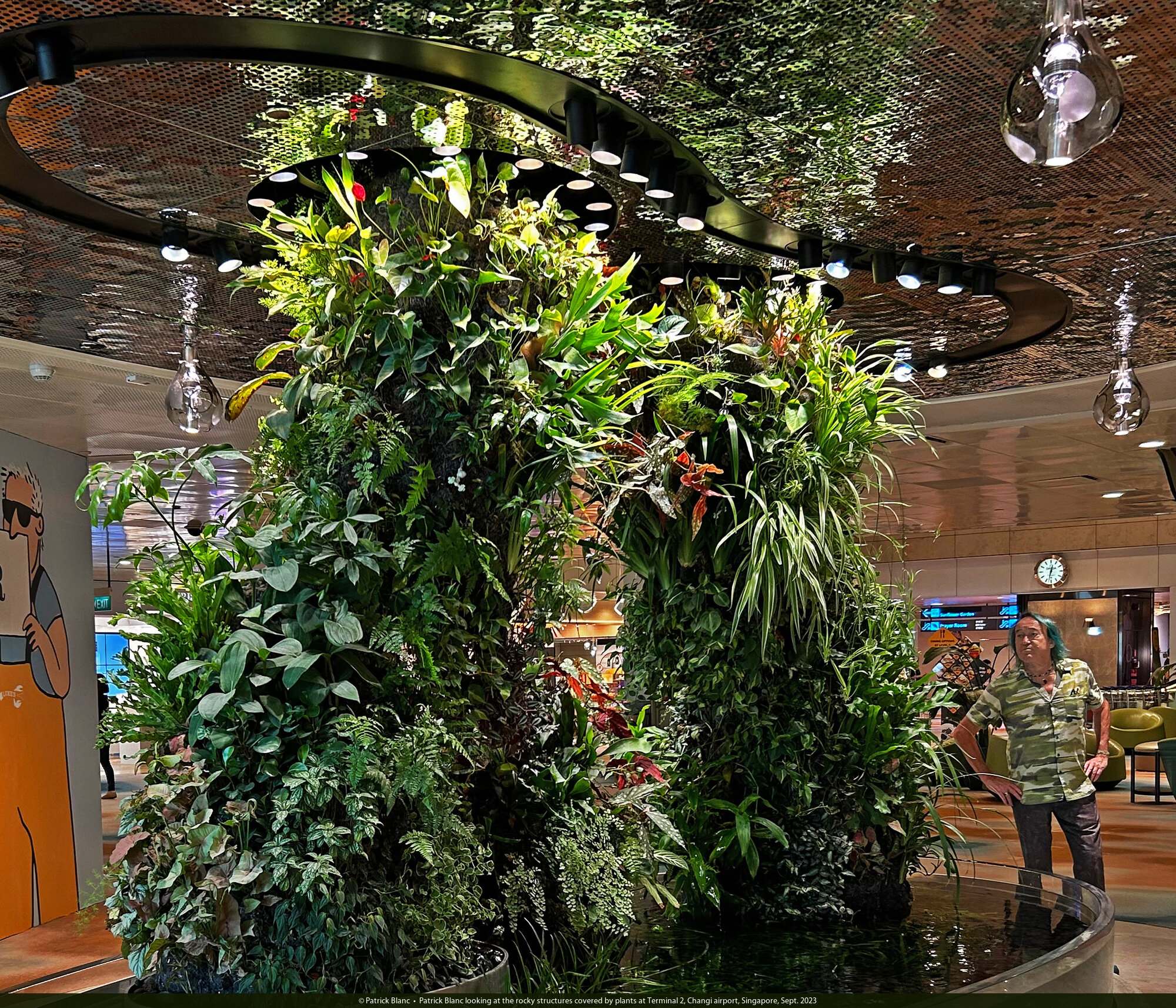 Patrick Blanc looking at the rocky structures covered by plants at Terminal 2, Changi airport, Singapore, Sept. 2023