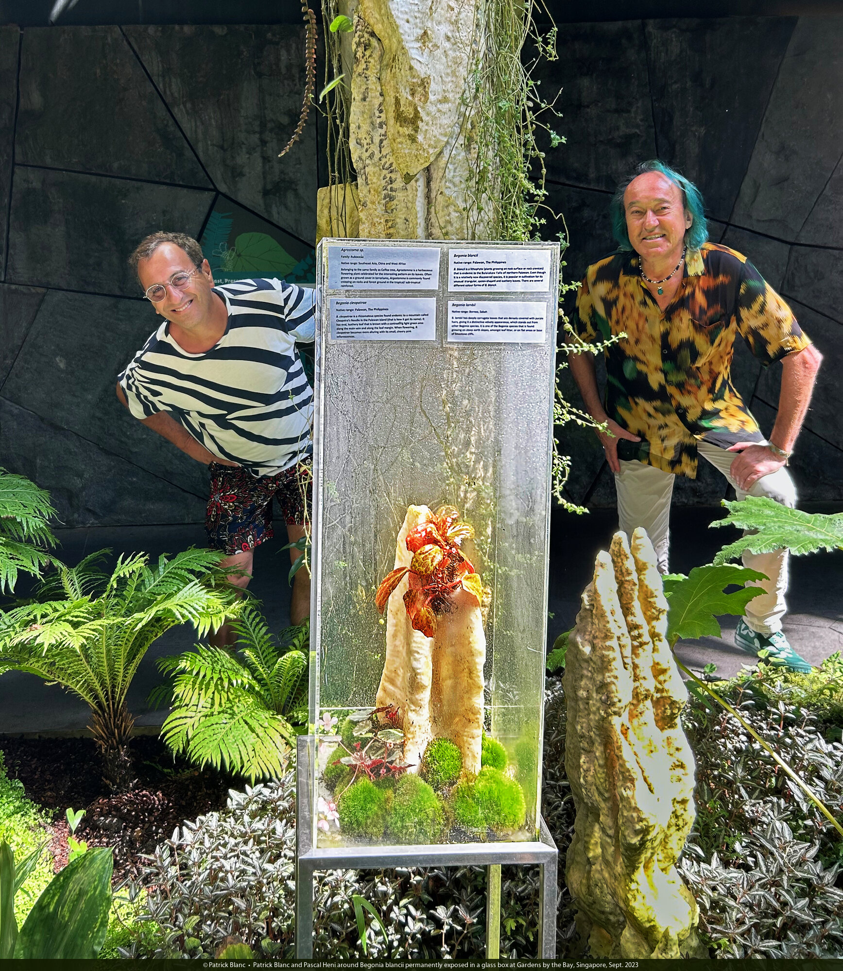 Patrick Blanc and Pascal Heni around Begonia blancii permanently exposed in a glass box at Gardens by the Bay, Singapore, Sept. 2023