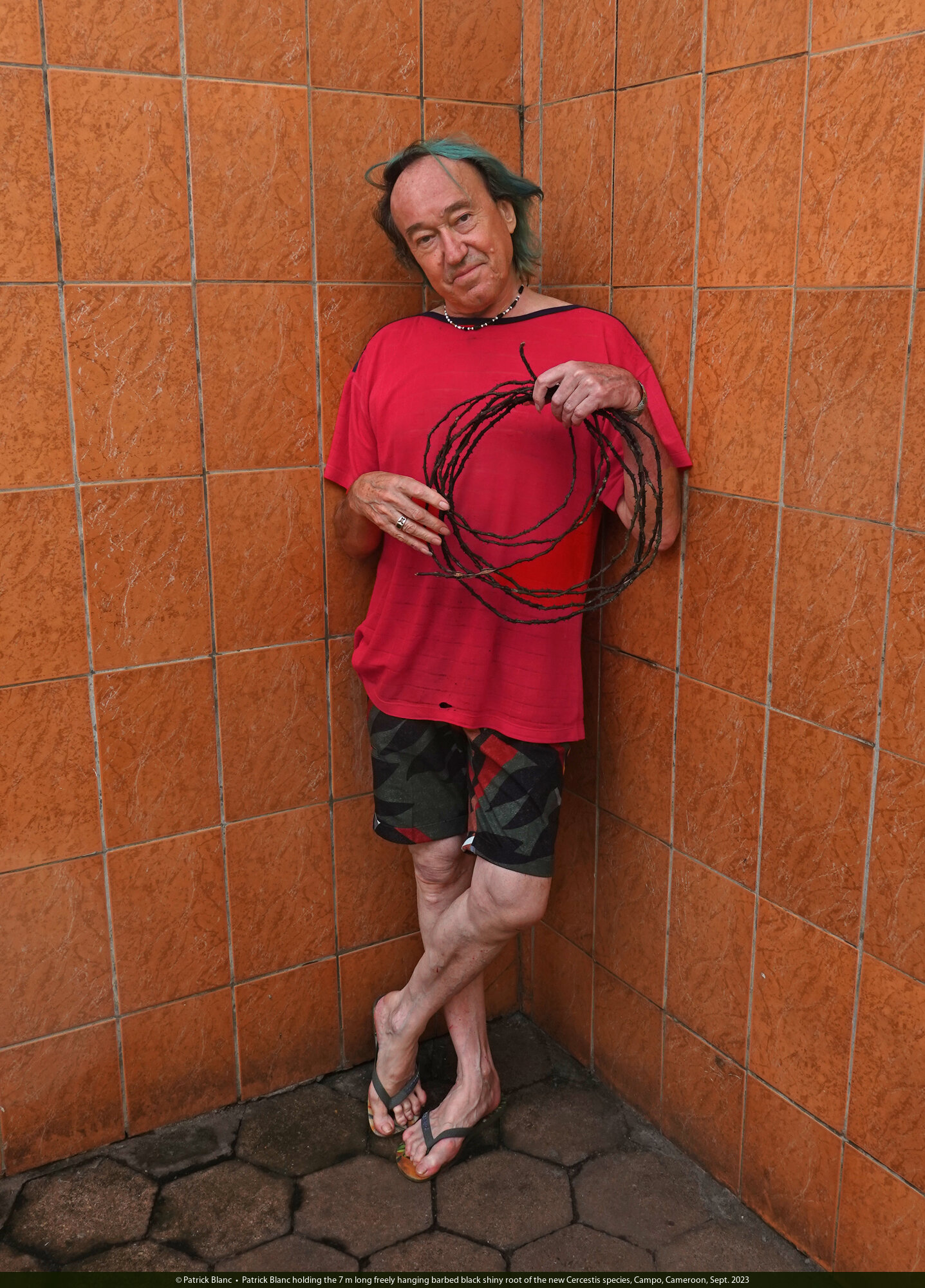 Patrick Blanc holding the 7 m long freely hanging barbed black shiny root of the new Cercestis species, Campo, Cameroon, Sept. 2023