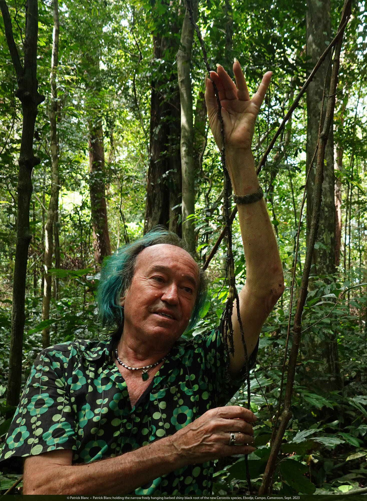 Patrick Blanc holding the narrow freely hanging barbed shiny black root of the new Cercestis species, Ebodje, Campo, Cameroon, Sept. 2023