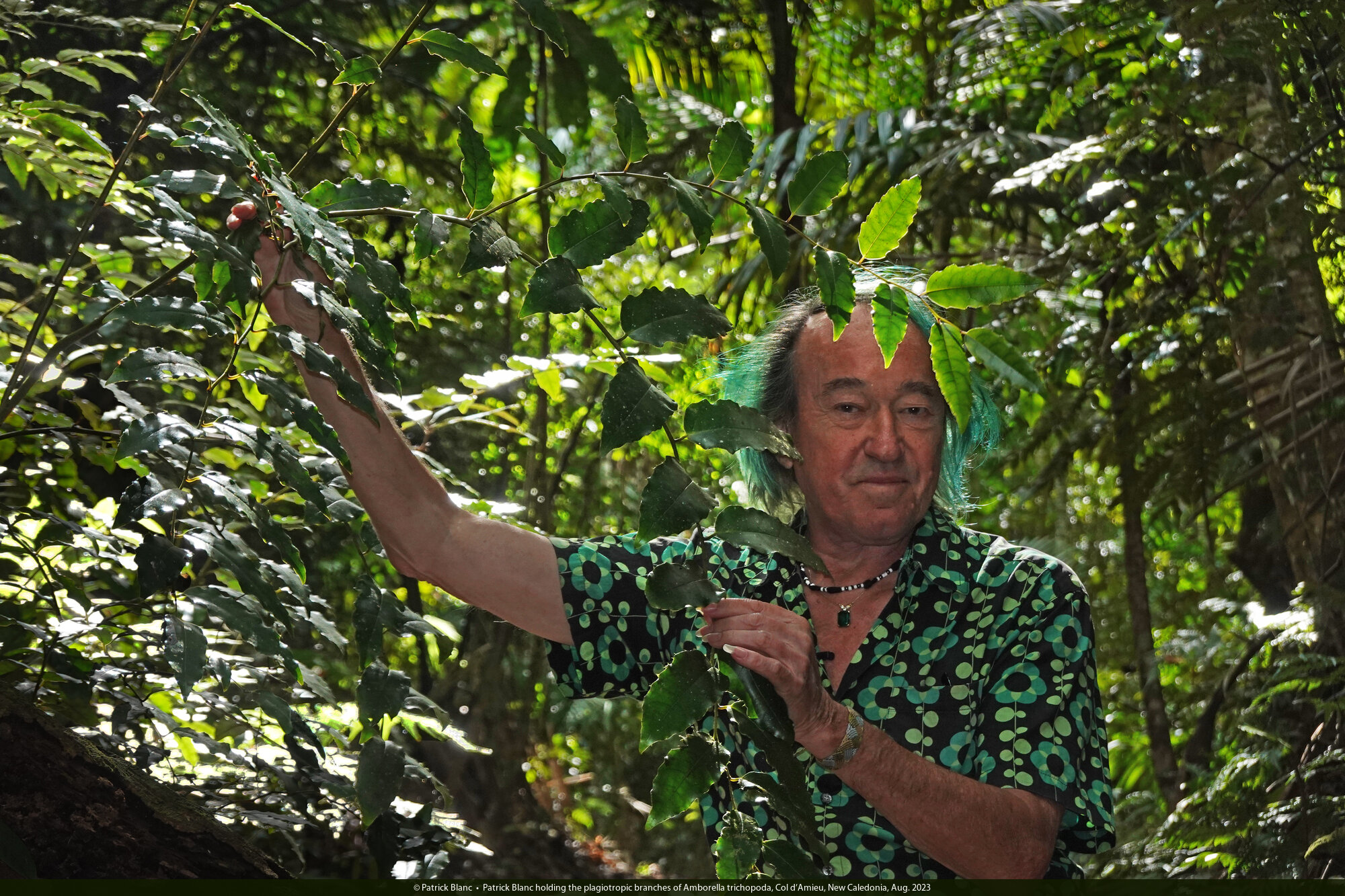 Patrick Blanc holding the plagiotropic branches of Amborella trichopoda, Col d'Amieu, New Caledonia, Aug. 2023