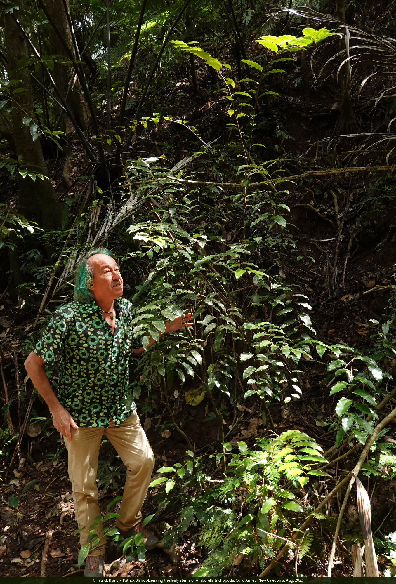 Patrick Blanc observing the foliage of Amborella trichopoda, Col d'Amieu, New Caledonia, Aug. 2023