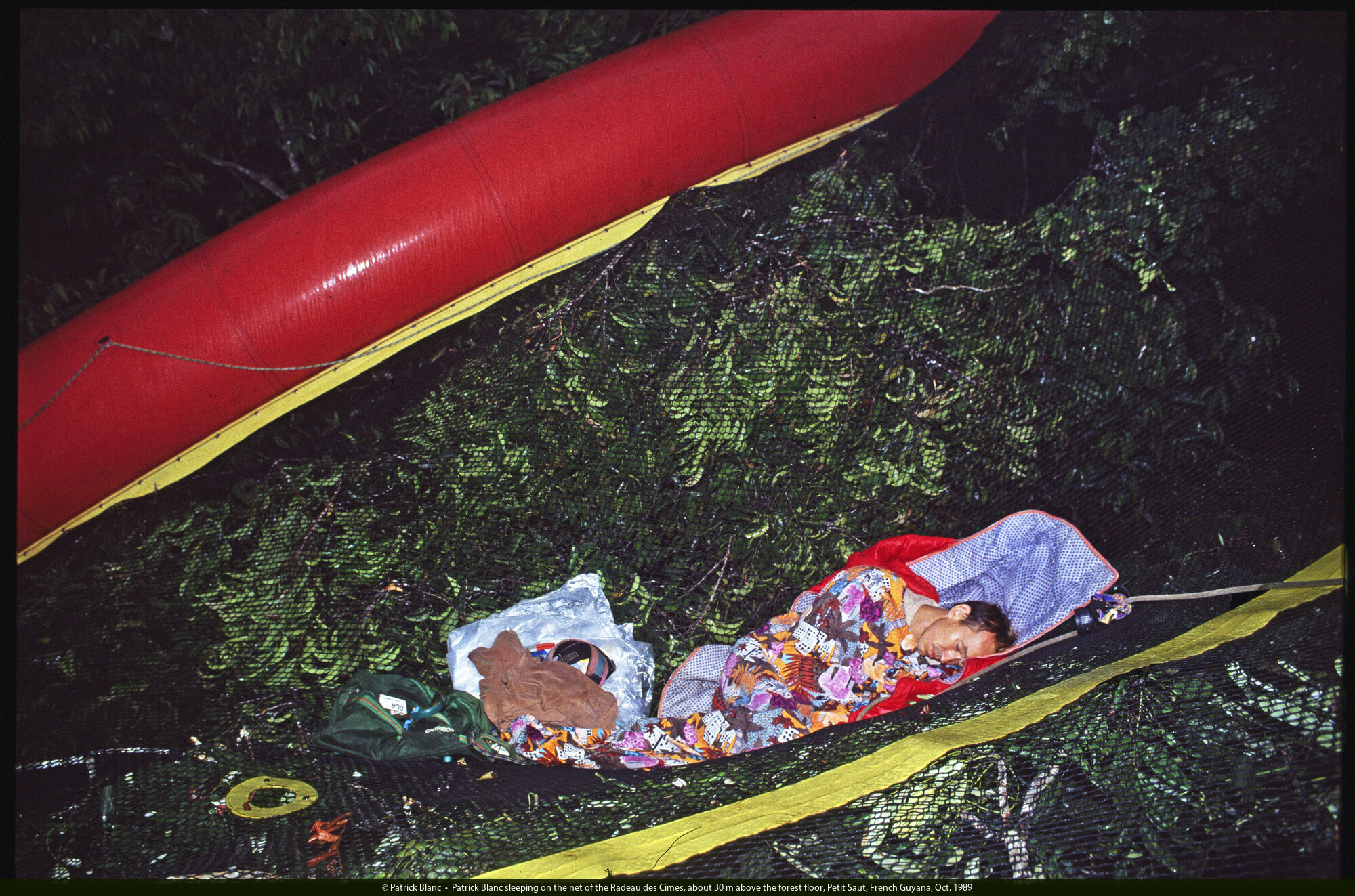 Patrick Blanc sleeping on the net of the Radeau des Cimes, about 30 m above the forest floor, Petit Saut, French Guyana, Oct. 1989