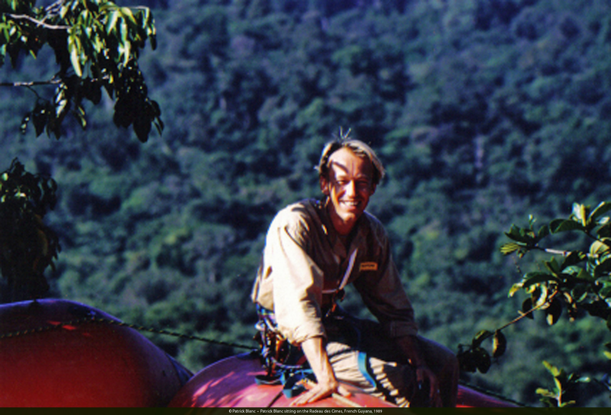 Patrick Blanc sitting on the Radeau des Cimes, French Guyana, Oct. 1989