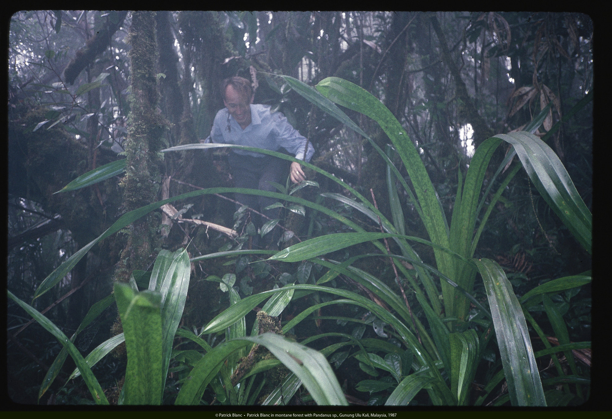 Patrick Blanc in montane forest with Pandanus sp., Gunung Ulu Kali, Malaysia, Aug. 1987